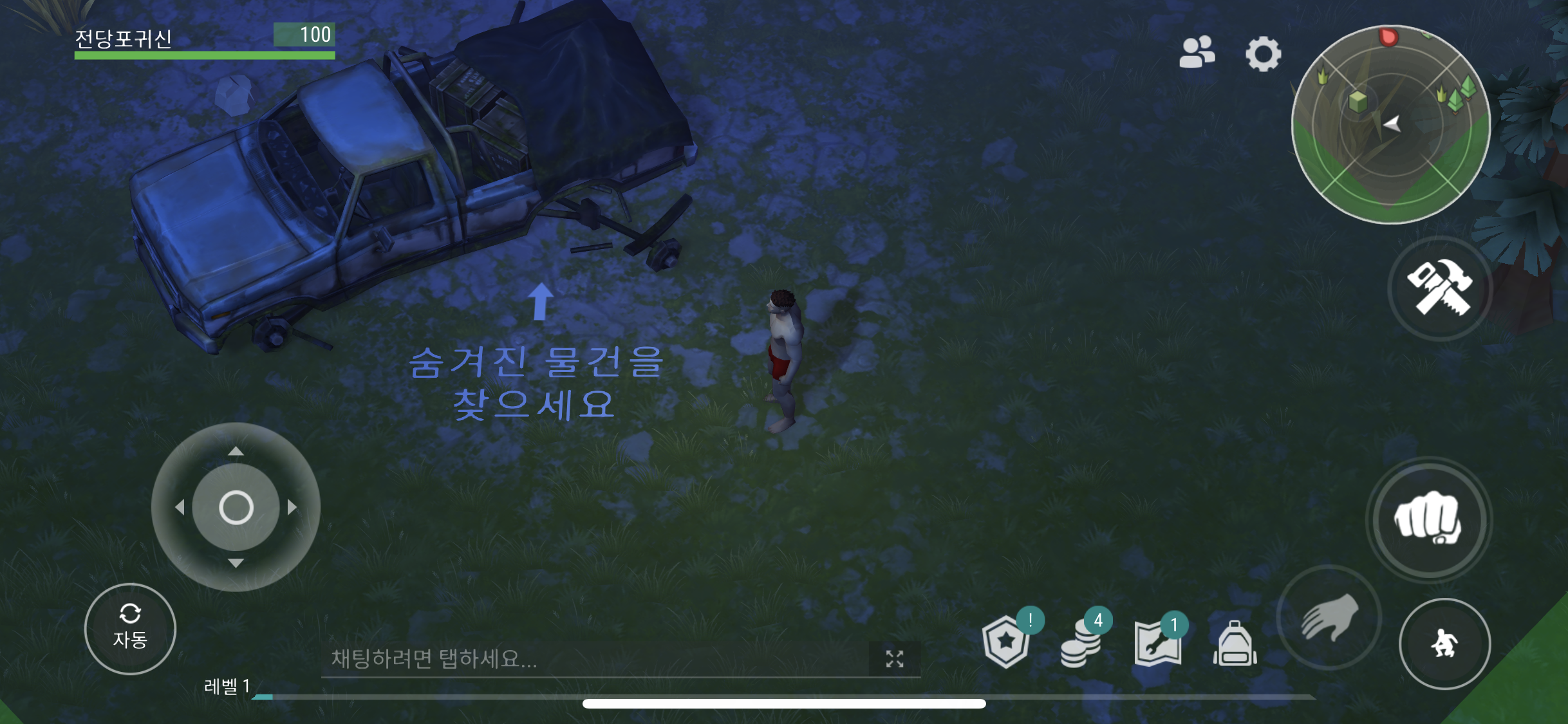 미니맵을 보게 되면, 나무, 수풀, 빨간색 표시 등이 보이는데, 자원이나 상자 좀비, 중립 동물 등이 표시 된다.