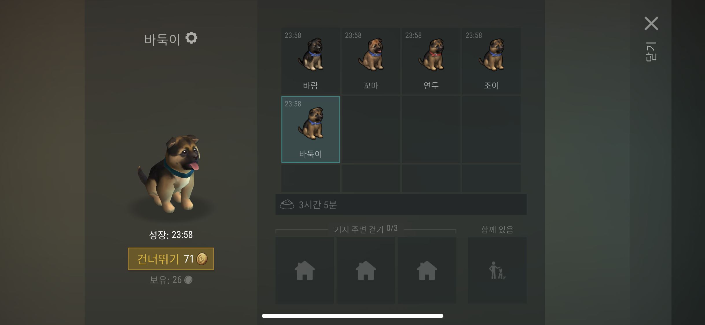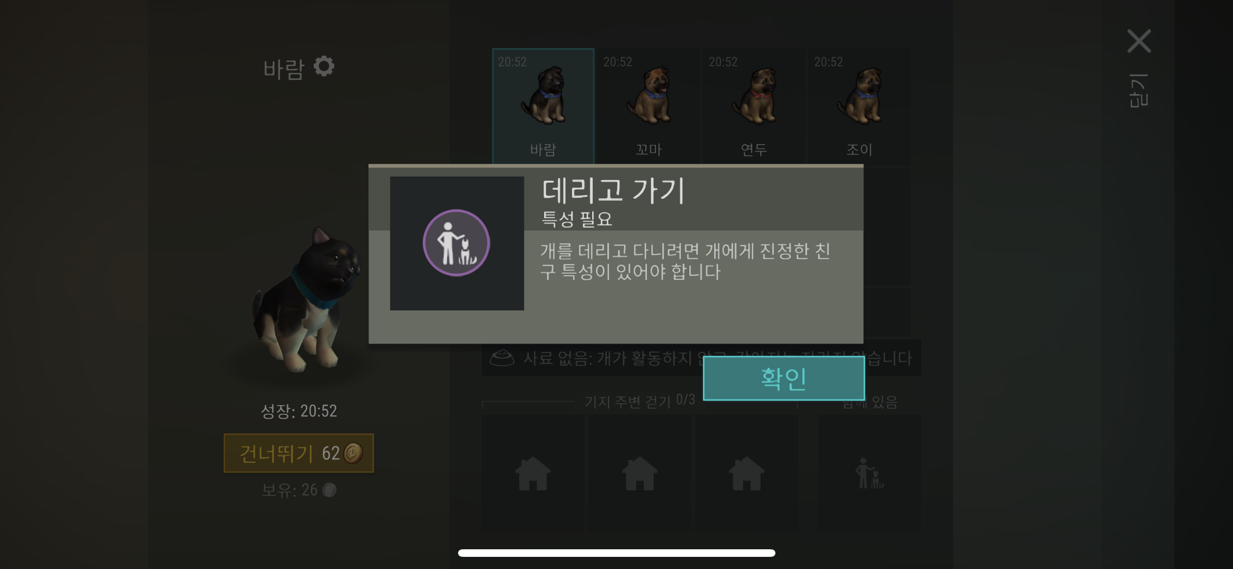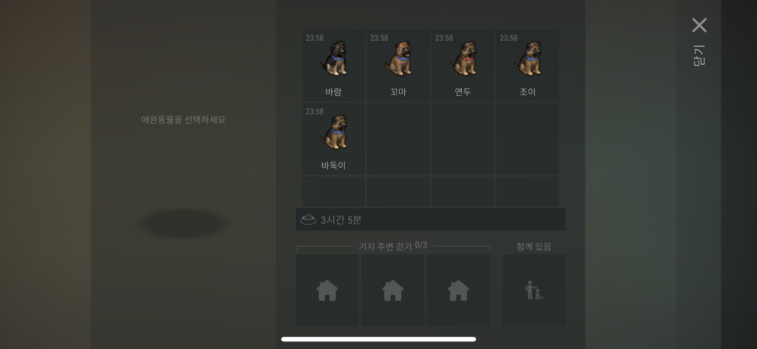 이런저런 이벤트 맵들에서 얻은 개들을 일단 넣어 보았다. 자동으로 네이밍 된 개들 이름이 귀엽다.