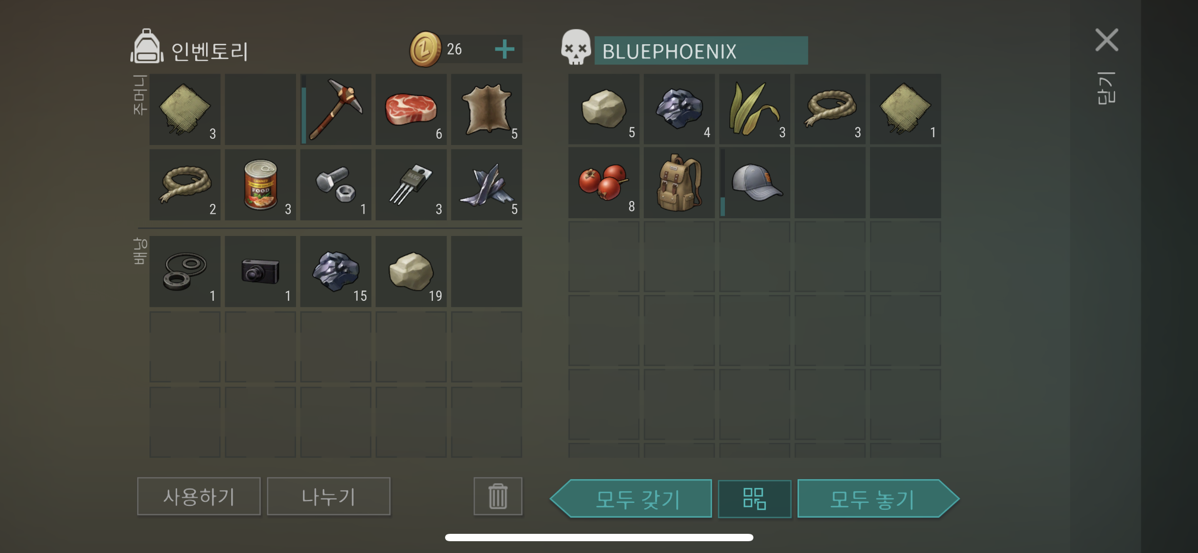 예를 들자면 소나무 통나무가 부족해서 소나무 덤불로 갔으면 일단 소나무 덤불을 손도끼가 허락하는데 까지 파밍하고 남는 칸에는 필요한 나머지 아이템으로 채운다.