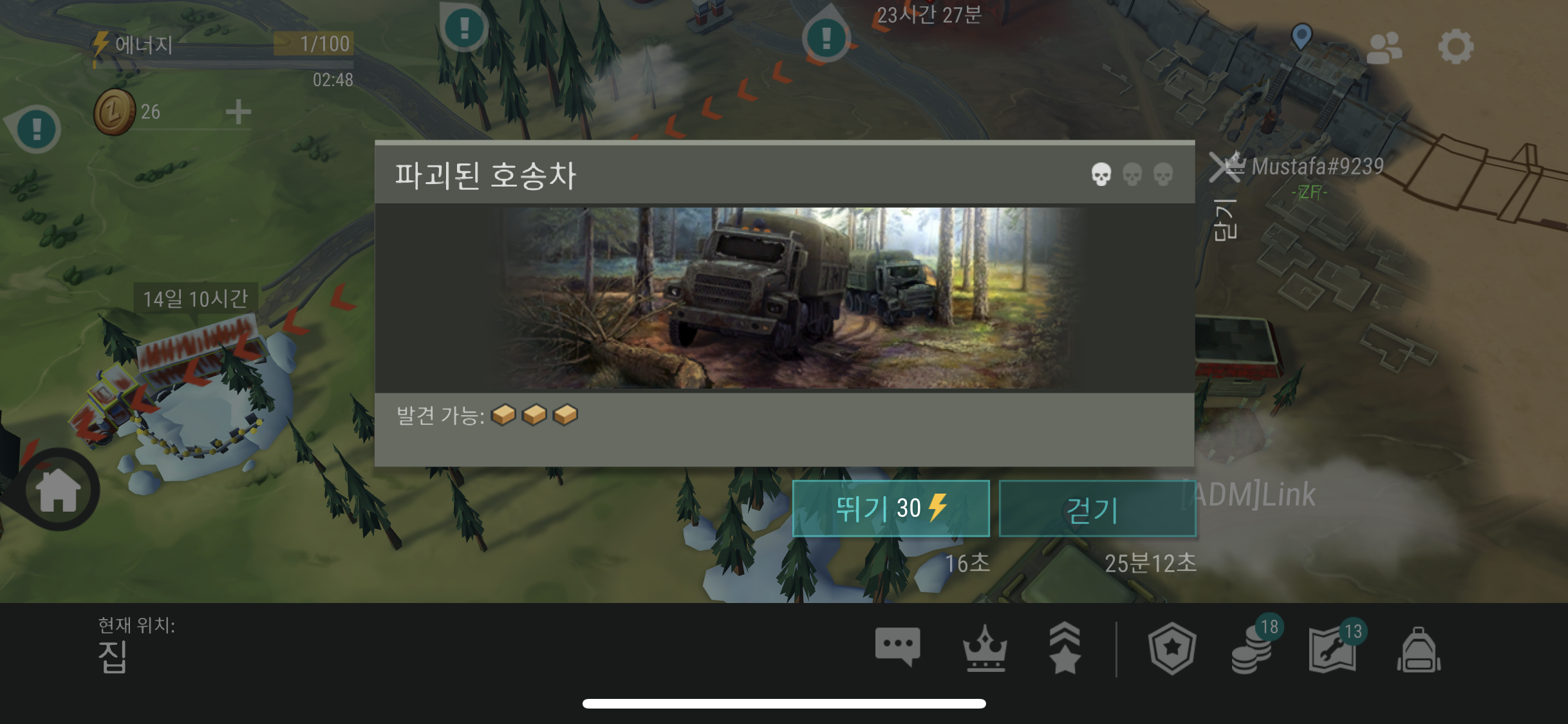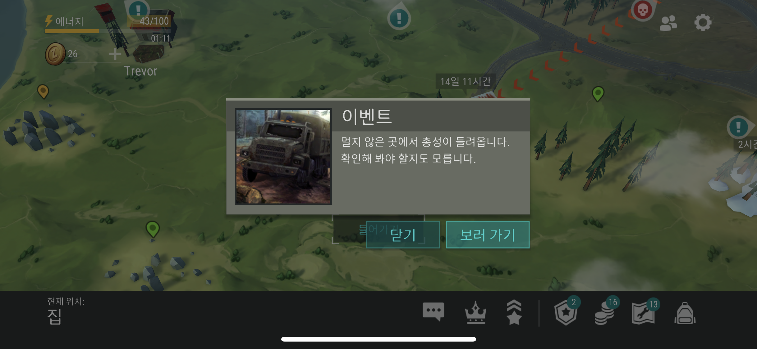 현재 렙 15렙. 지구의 마지막날 생존을 다시 시작한지 이제 일주일이 지난 듯 하다. 초반에 월드맵으로 나가 보면 이벤트 맵들이 꽤 나타난다 그 중 하나인 파괴된 호송차 이벤트맵이다.