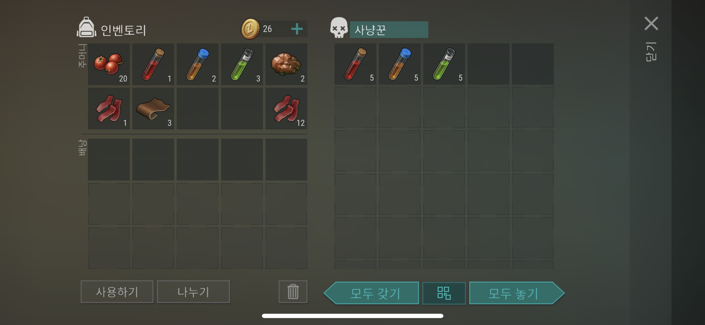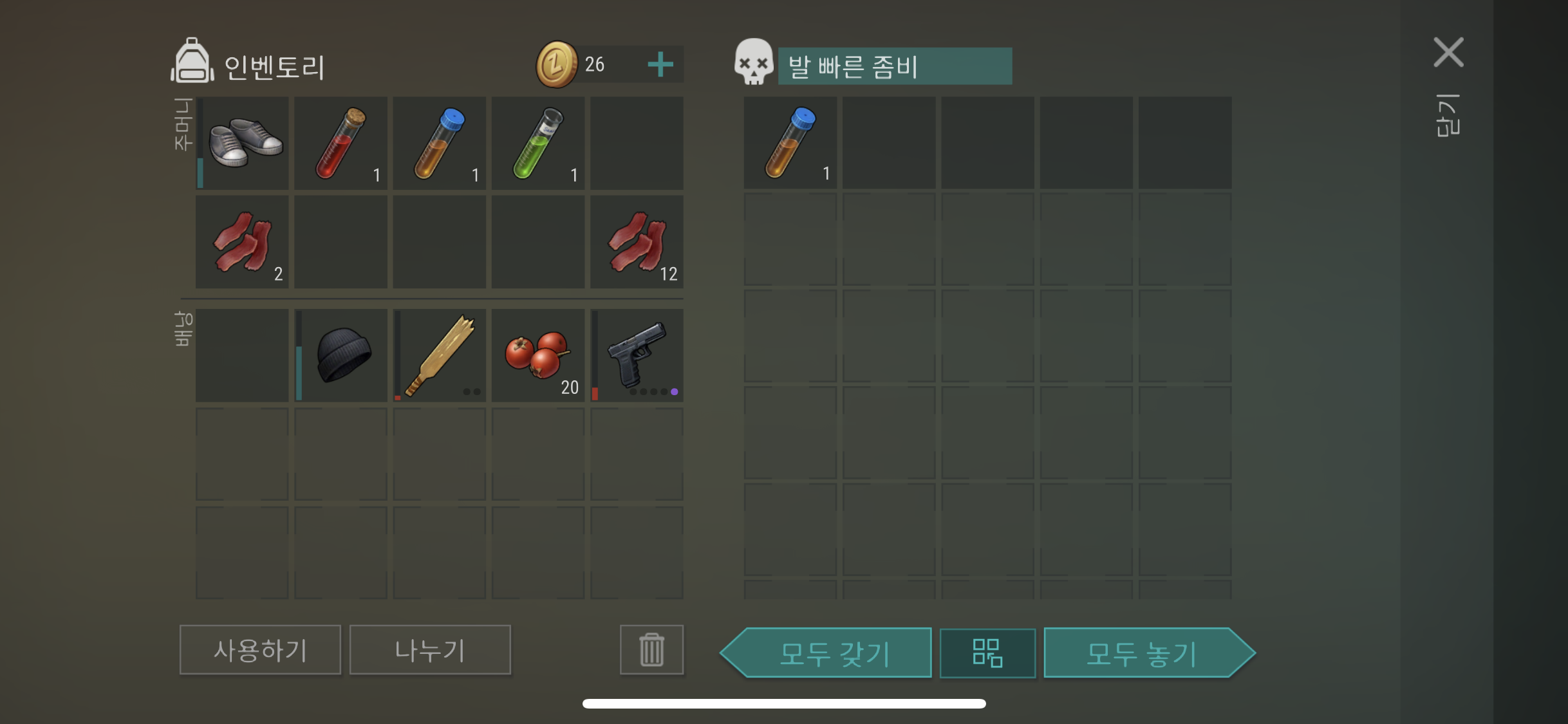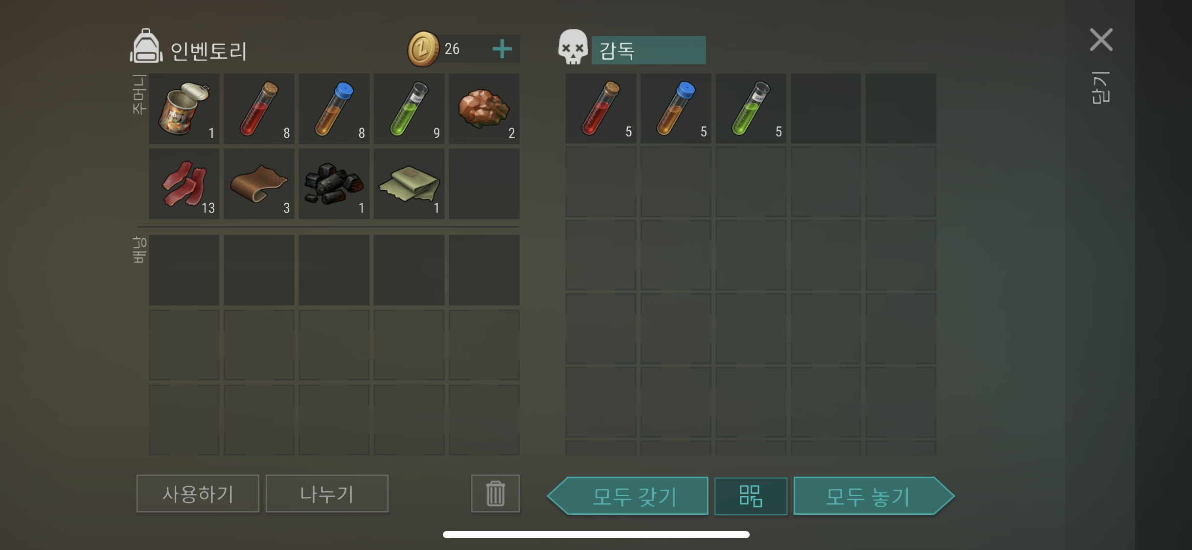 대략적으로 소비한 아이템을 보면 마테체2자루, 당근이나 열매 40, 방어구 등 연속 사망 후 글록은 2자루 챙겨가서 감독을 처치 했다.