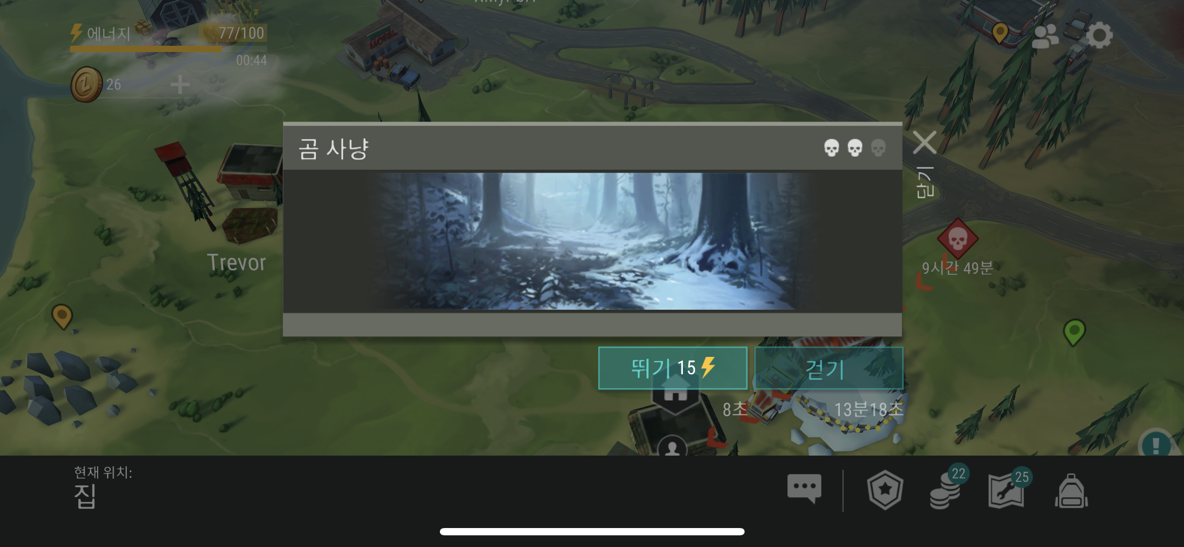 소나무 잡목림에서 좀비곰을 쫒아낸 후 추가로 발생 되는 맵은 곰 사냥 이라는 맵이 발생 되는데 이 맵으로 들어가게 되면 좀비곰이 사슴시체를 먹고 있는데 이번에 삽으로 공격을 하니 또 데미지가 들어가지 않았다. 아마 나의 경우에는 톱날 철퇴를 이용해서 좀비 곰을 공격 해야 하는 듯 했다. 그래서 일단 후퇴를 해야 했다. 아직은 근접무기 개조 능력도 없고 하니..