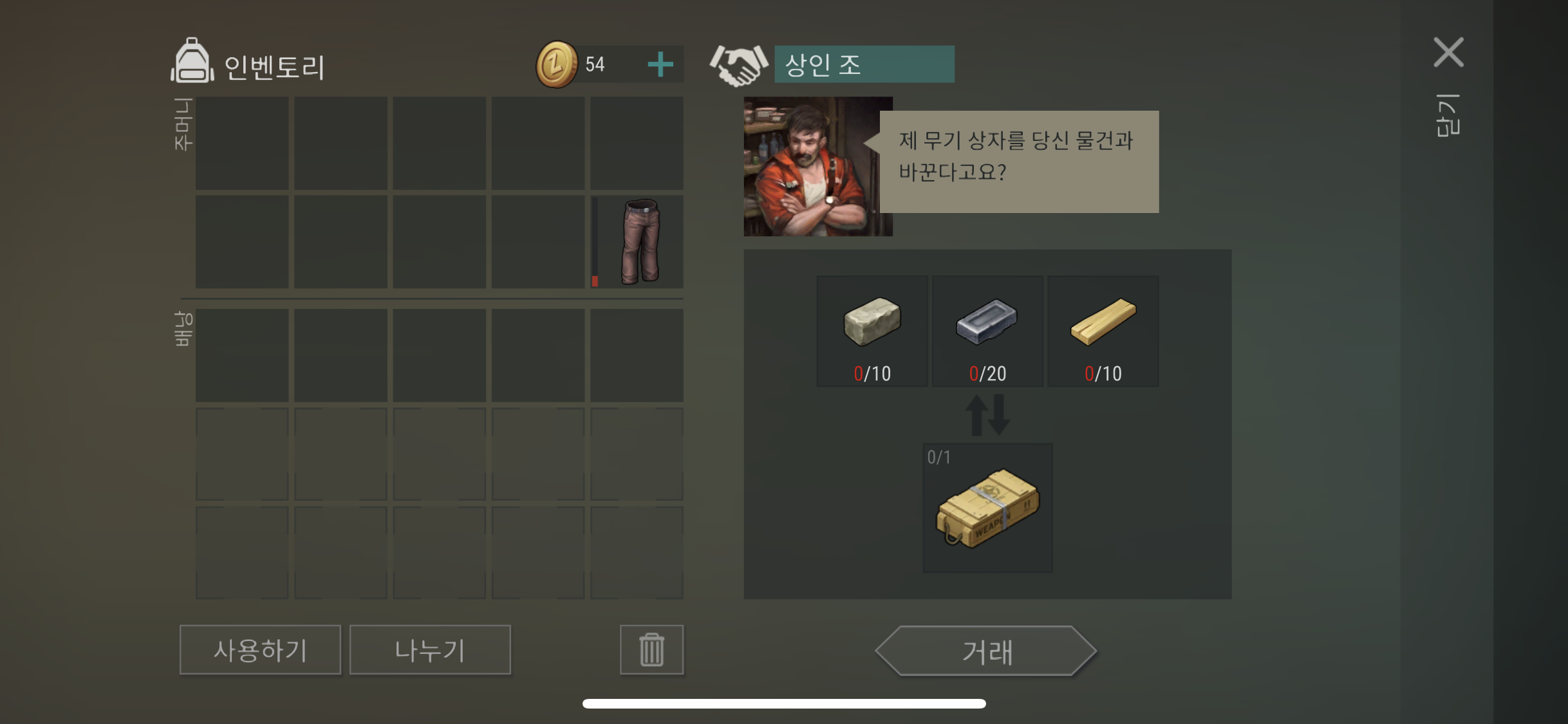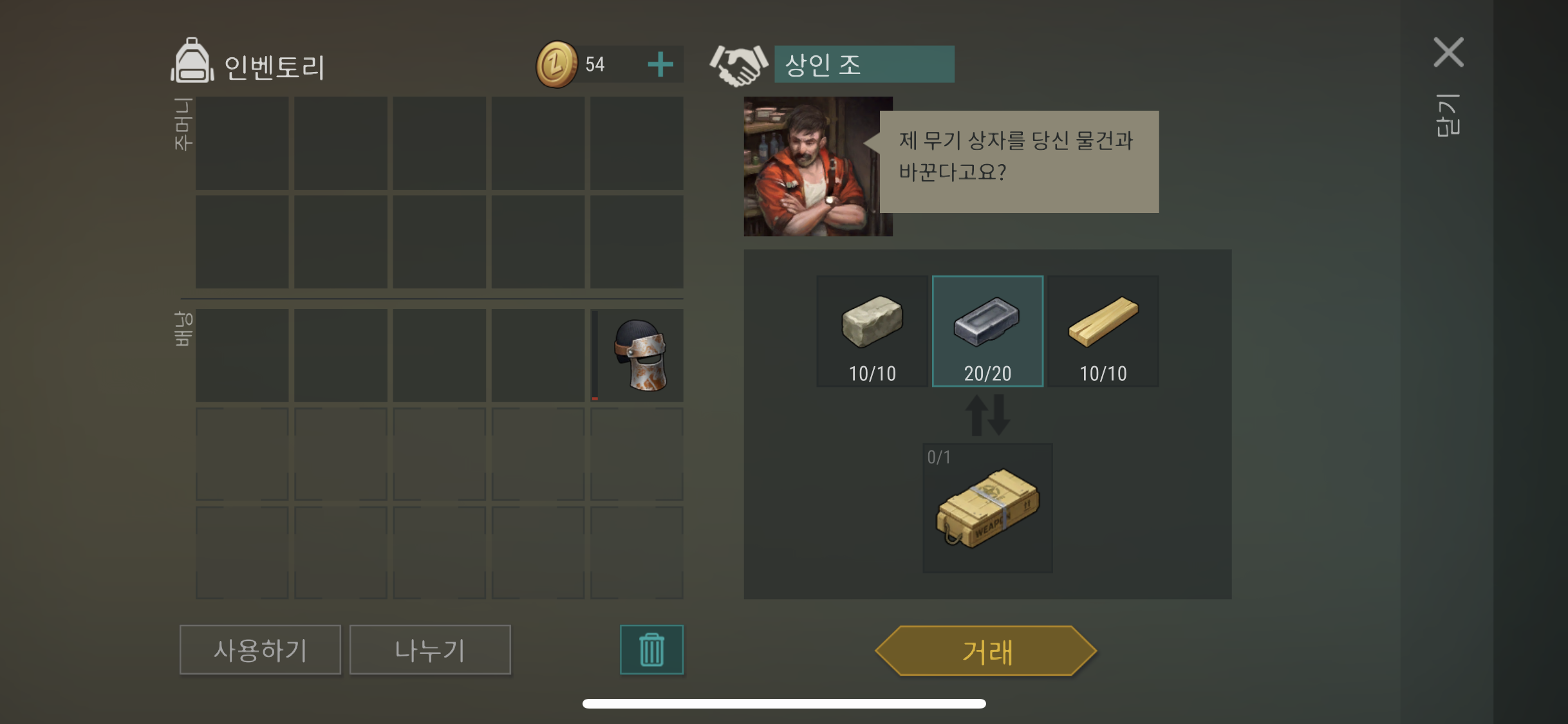 지구의 마지막날 생존 게임 내에서 그나마 쉬운 방법으로 중급정도의 무기를 물물교환하는 방식으로 얻을 수 있다. 어느 정도 레벨이 오르고 공격 무기가 부족하다 싶을때 사용하면 좋을 듯 하다. 보통은 집 기지 근처 주변에 상인 이라는 명칭으로 월드맵에 표시 된다.