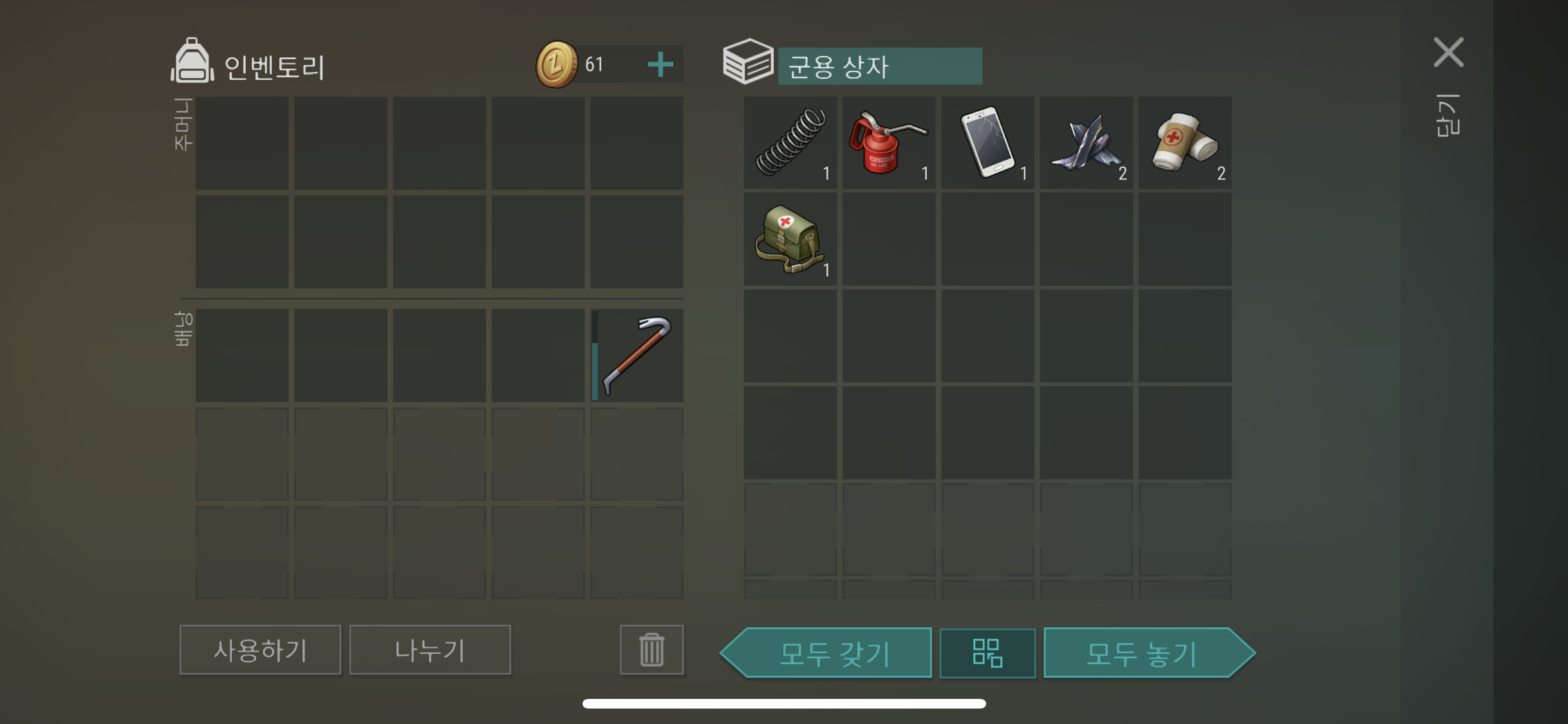 첫 상자에서는 처음 보는 아이템 총기용 기름이 나왔다. 어디에 쓰이는지 보니 폭발성 물질을 만들 때 10개나 들어간다.