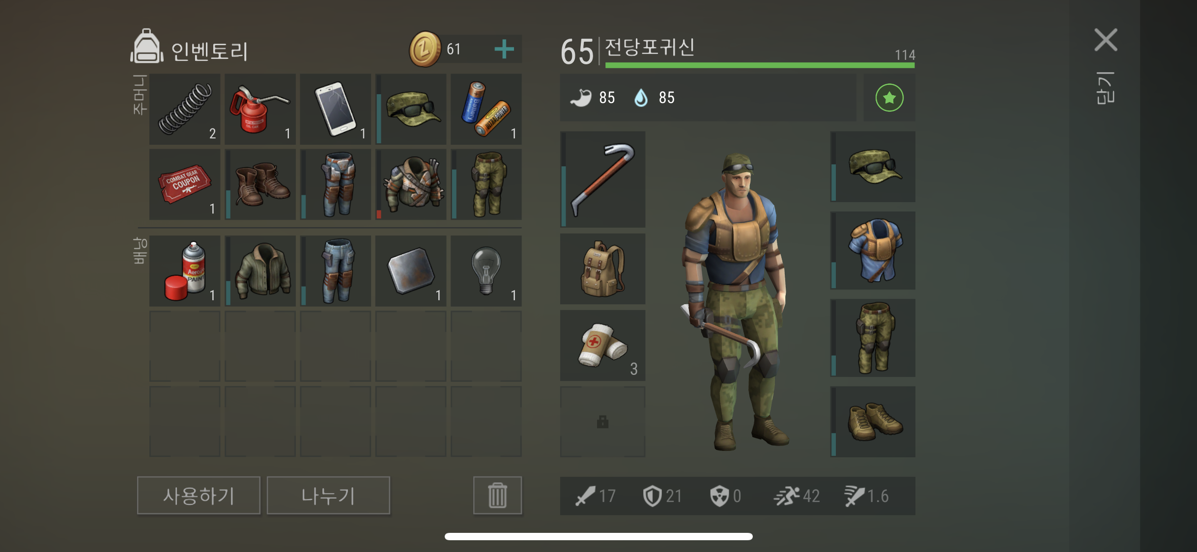 #. 이 글은 지구의 마지막날 생존 게임 초보자가 작성한 글 이므로 실제 게임 내 정보와 정확하거나 불일치하는 정보들도 있을 수 있으니 좀 더 상세하고 정확한 내용은 나무 위키 참조 바람.