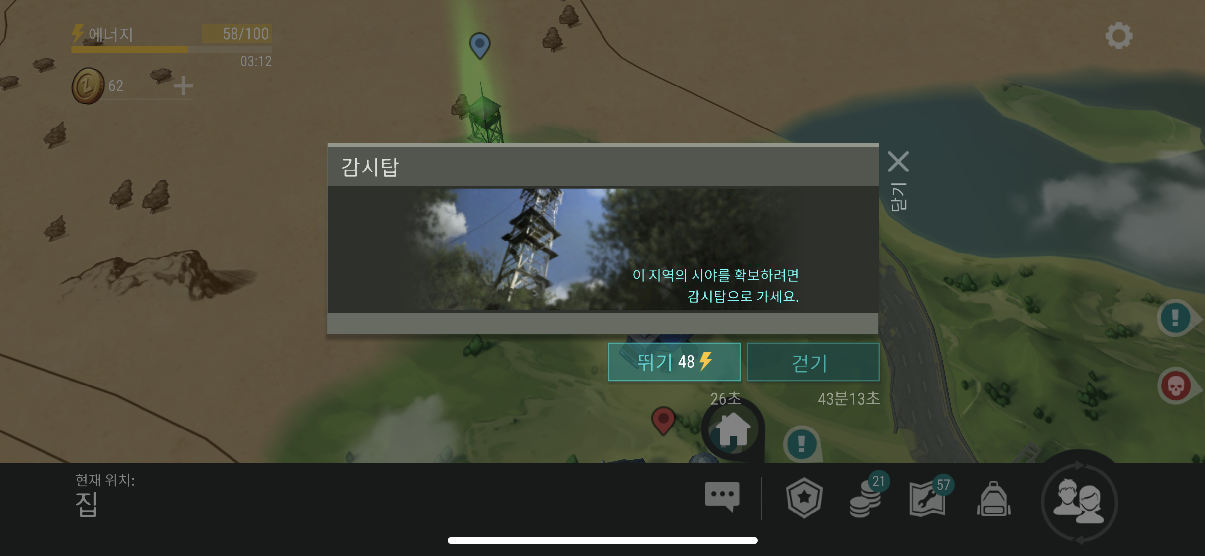 감시탑을 둘러 보는 중 미니맵 안쪽을 보니 노란색 아이콘이 보이는데 전기가 필요하다는 표시로 보여진다. 아마 발전기를 만든 후 이곳으로 가져온 후 감시탑을 가동시키는 그런 미션 인 듯 하다.(?)