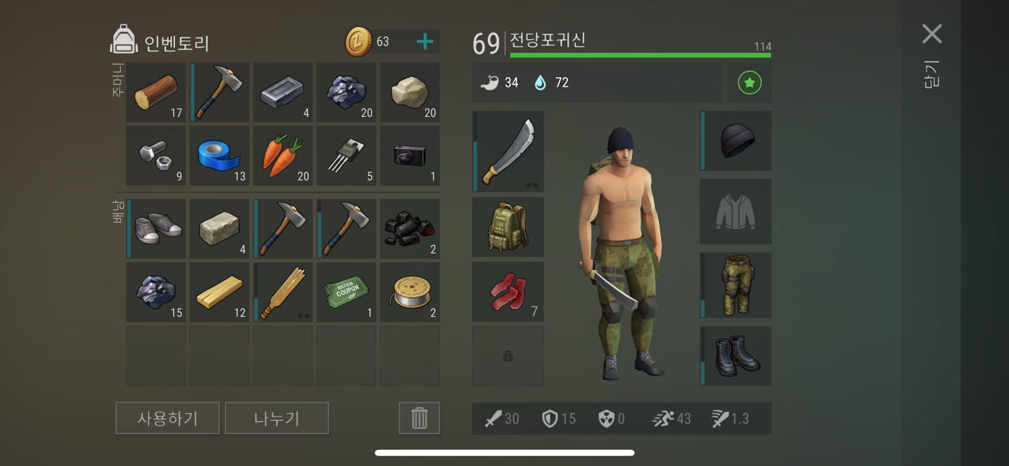 최종적으로 파밍한 아이템들이다. 물병이나 맥주등의 기본템은 그냥 놔둔 후 아이템 중요도에 따라서 가져왔다. 철 손도끼 두 자루는 사용하지도 않고 그대로 다시 들고 기지로 복귀 해야만 했다. 하지만 철저히 준비 해 두어서 나쁠 것은 없다. 방어구나 무기 아이템의 경우 맨 몸으로 갔기에 실 착용을 해 주어 인벤토리 공간을 확보해 준다. 역시나 군용 배낭 장착하여 배낭의 인벤토리 공간이 10칸으로 늘어 아이템 확보에 여유가 있다.