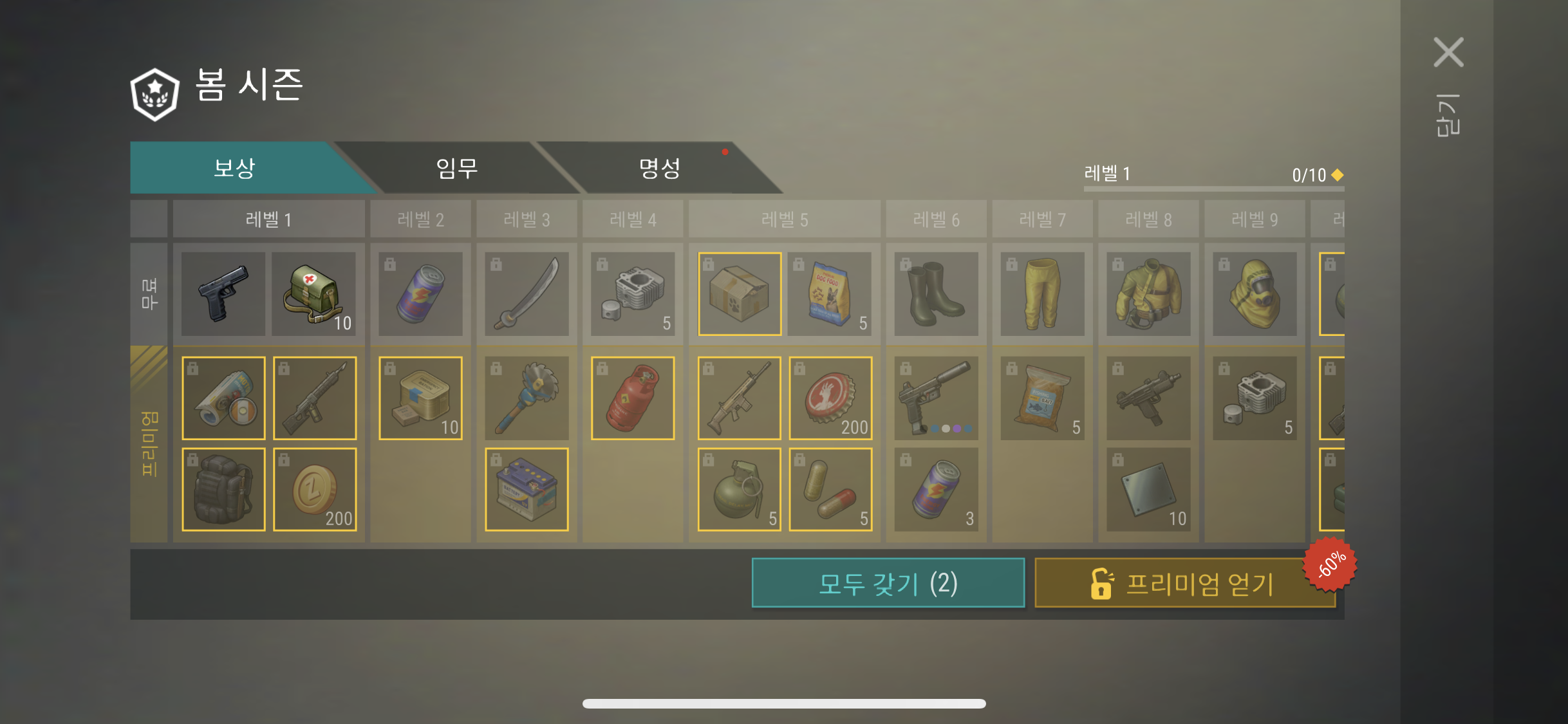 시즌 버튼을 눌러보면 이렇게 레벨별 보상 메뉴가 뜬다.
