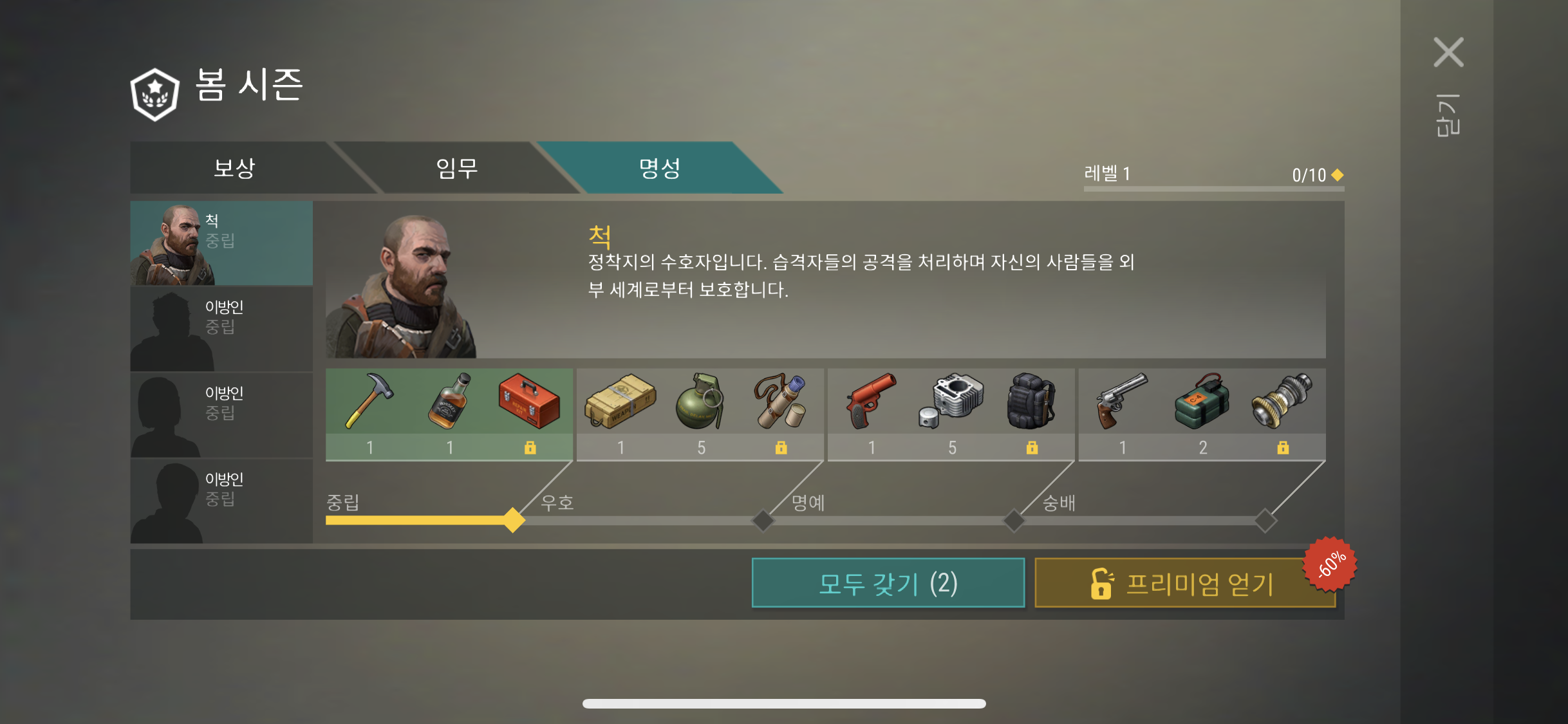 이렇게 시즌 메뉴를 누르게 되면 각 캐릭터 별 명성에 대한 지표가 나오는데 이번 시즌은 이 명성을 올려주면 보상을 받고 끝나는 것인가 보다.