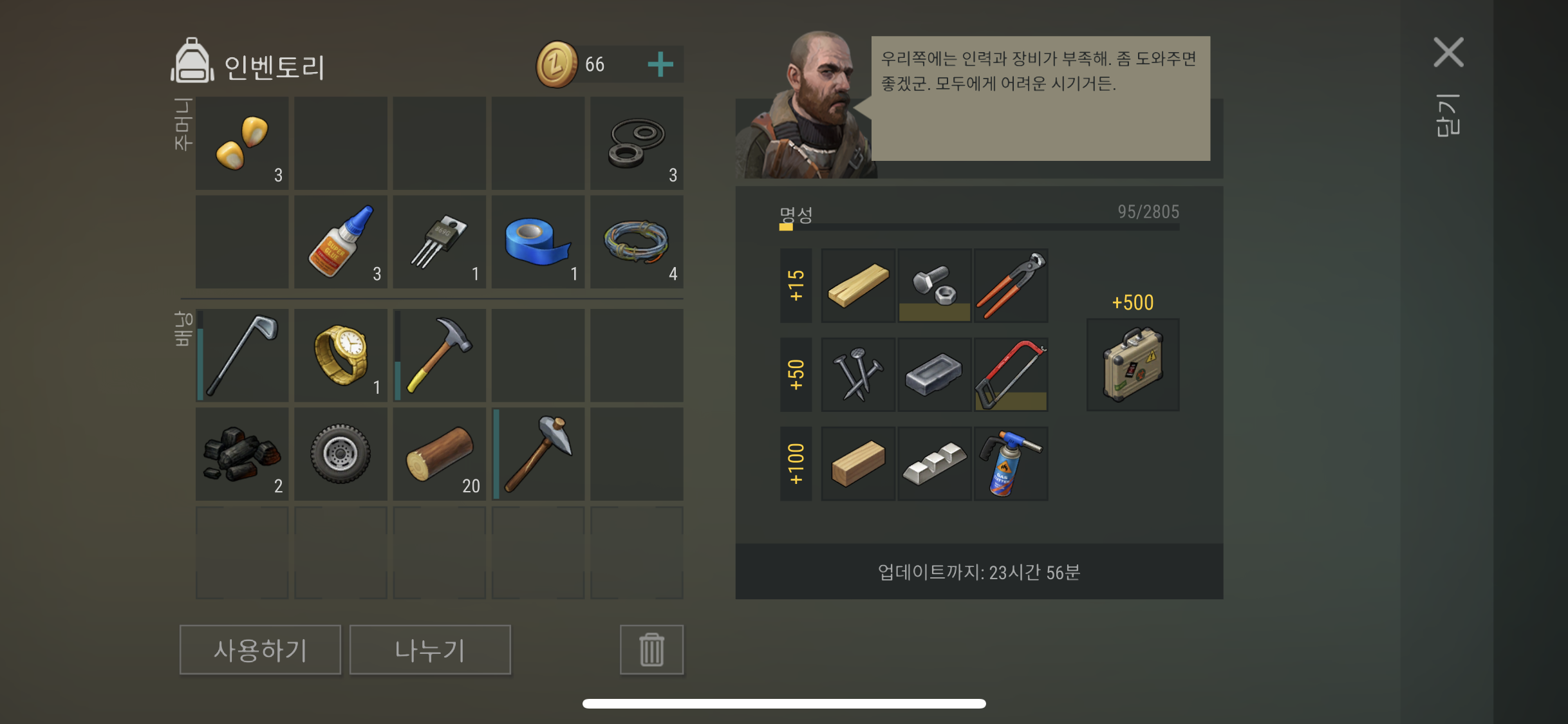 #. 이 글은 지구의 마지막날 생존 게임 초보자가 작성한 글 이므로 실제 게임 내 정보와 정확하거나 불일치하는 정보들도 있을 수 있으니 좀 더 상세하고 정확한 내용은 나무 위키 참조 바람.