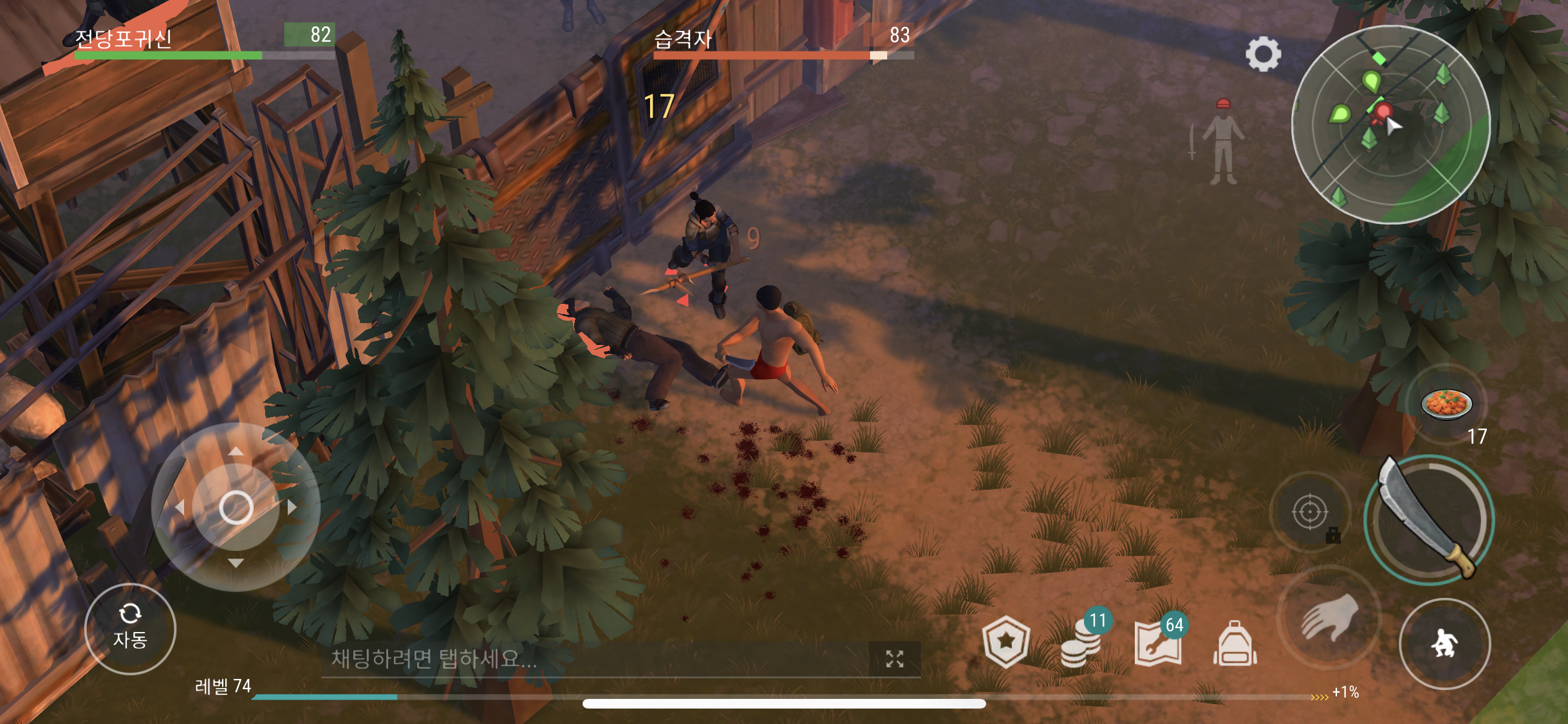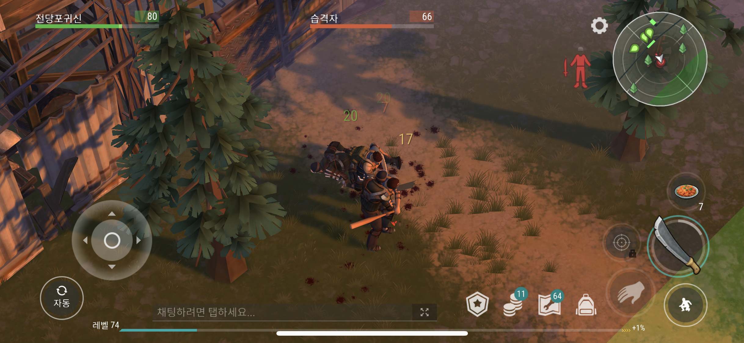 그게 끝인 줄 알았지만 정착지 울타리의 문이 열리자 마자 또다른 습격자 놈들이 튀어나와 공격 하는 바람에 또 죽을 뻔 했다. 완전무장을 하지 않은 상태라 챙겨온 당근스튜도 다 먹어가면서 겨우겨우 처리 할 수 있었다. 다음 부턴 처음 탐색하는 장소 방문 할 경우에는 아느 정도 무장을 하고 방문 해야겠다.