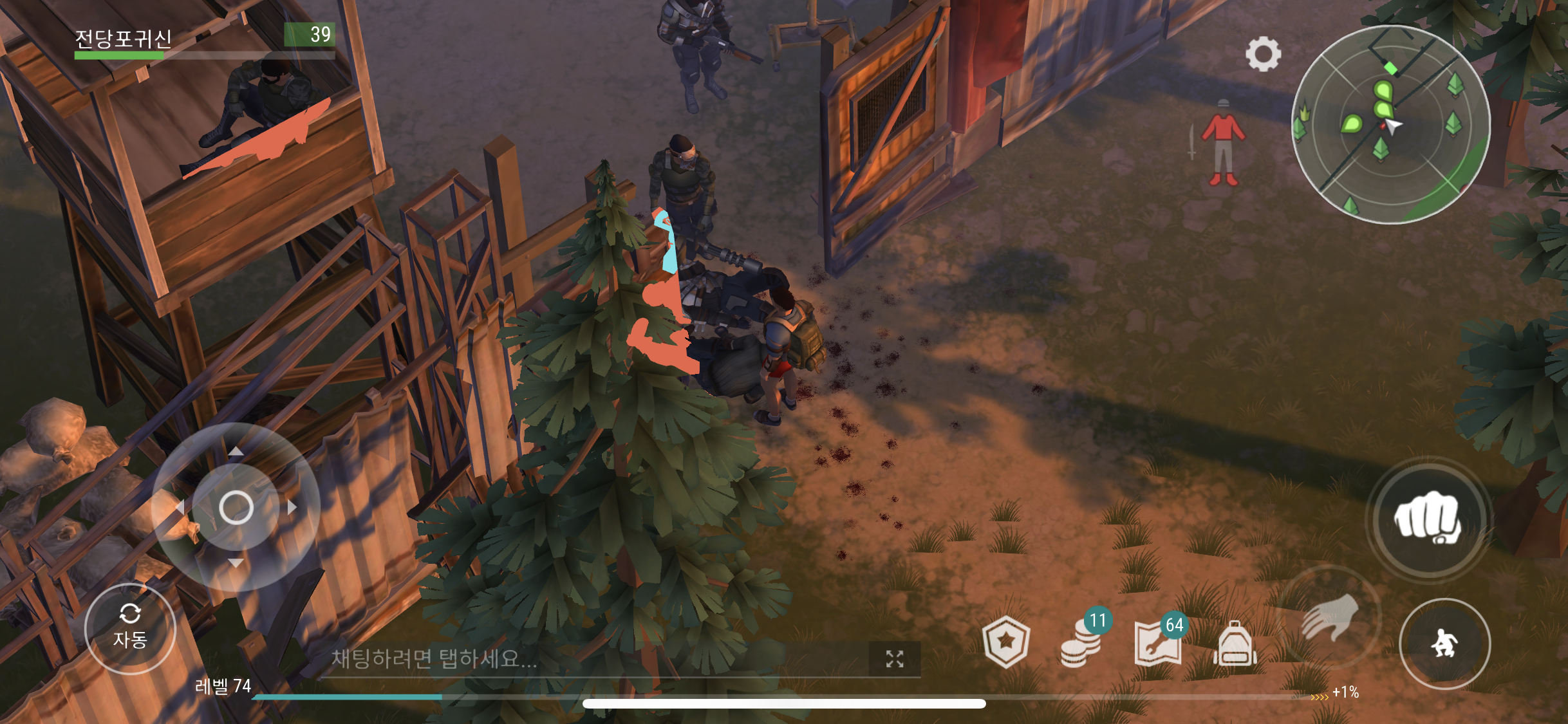 정착지에 도착하니 어떤 문 앞을 습격자 두명이 가로 막고 있었다. 미니맵에 노란색으로 표시 되길래 좀 더 가까이 갔더니..