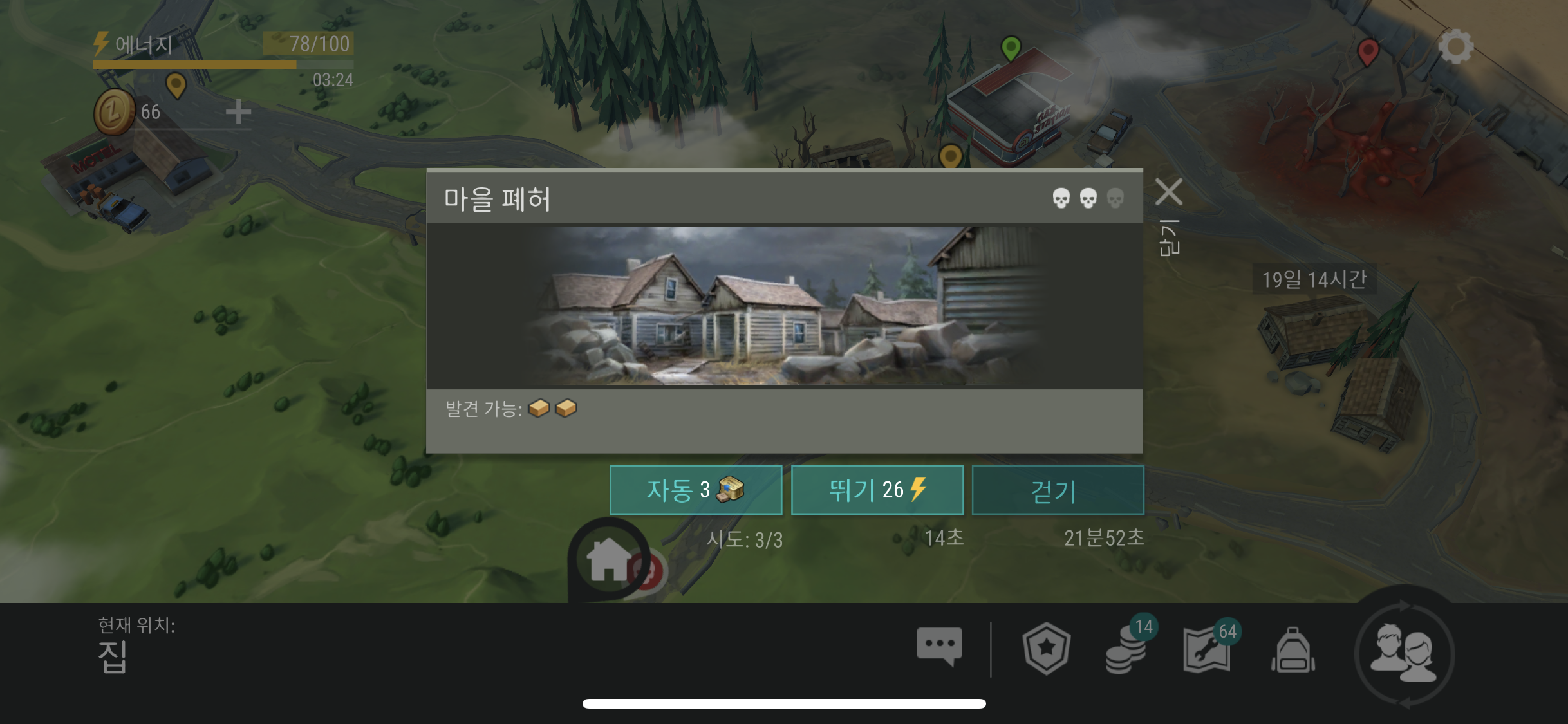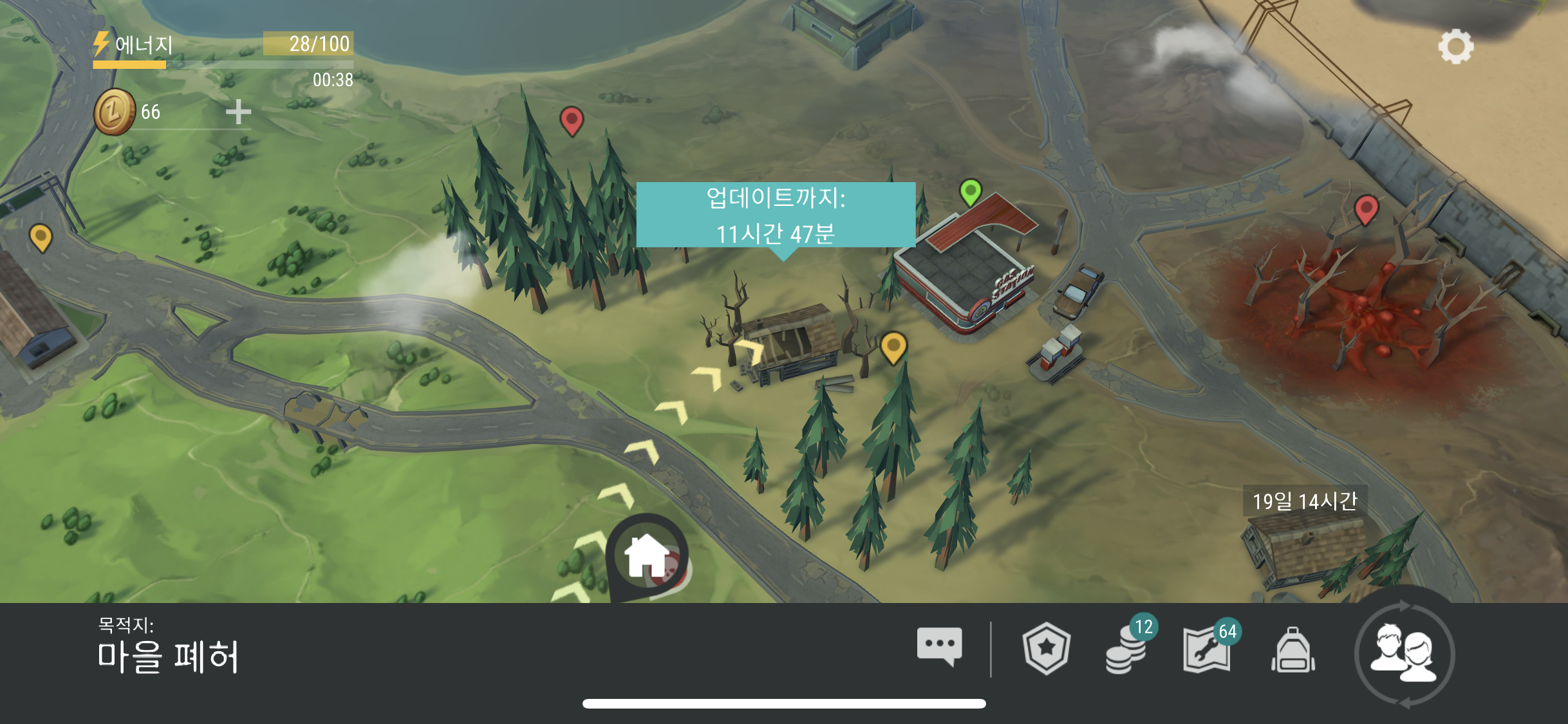 결국 기지에서 다시 마을 폐허로 이동한다. 한번 들어 갔다 나오게 되면 이렇게 업데이트까지의 남은 시간이 표기 된다. 이 시간이 지나면 초기화 되는 것이다.