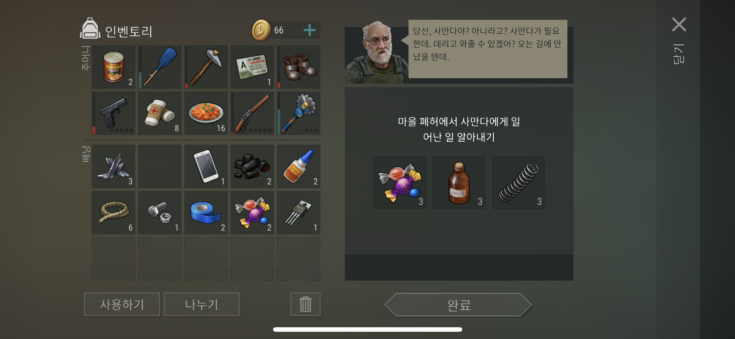 마을 폐허 지상으로 올라와 주변을 살펴보면 아까 자겨 있던 북동쪽 집의 문이 열리는 데 그 문이 열리면 좀비 몇마리와 함께 사만다가 보인다. 좀비 처리 후 사만다를 따라가는데 사만다도 좀비였다. 도망간 사만다를 잡은 후 다시 정착지의 해리에게 가보면 드디어 보상을 받을 수 있고, 해리의 명성도 올릴 수 있는 아이템 목록이 드디어 보여진다.