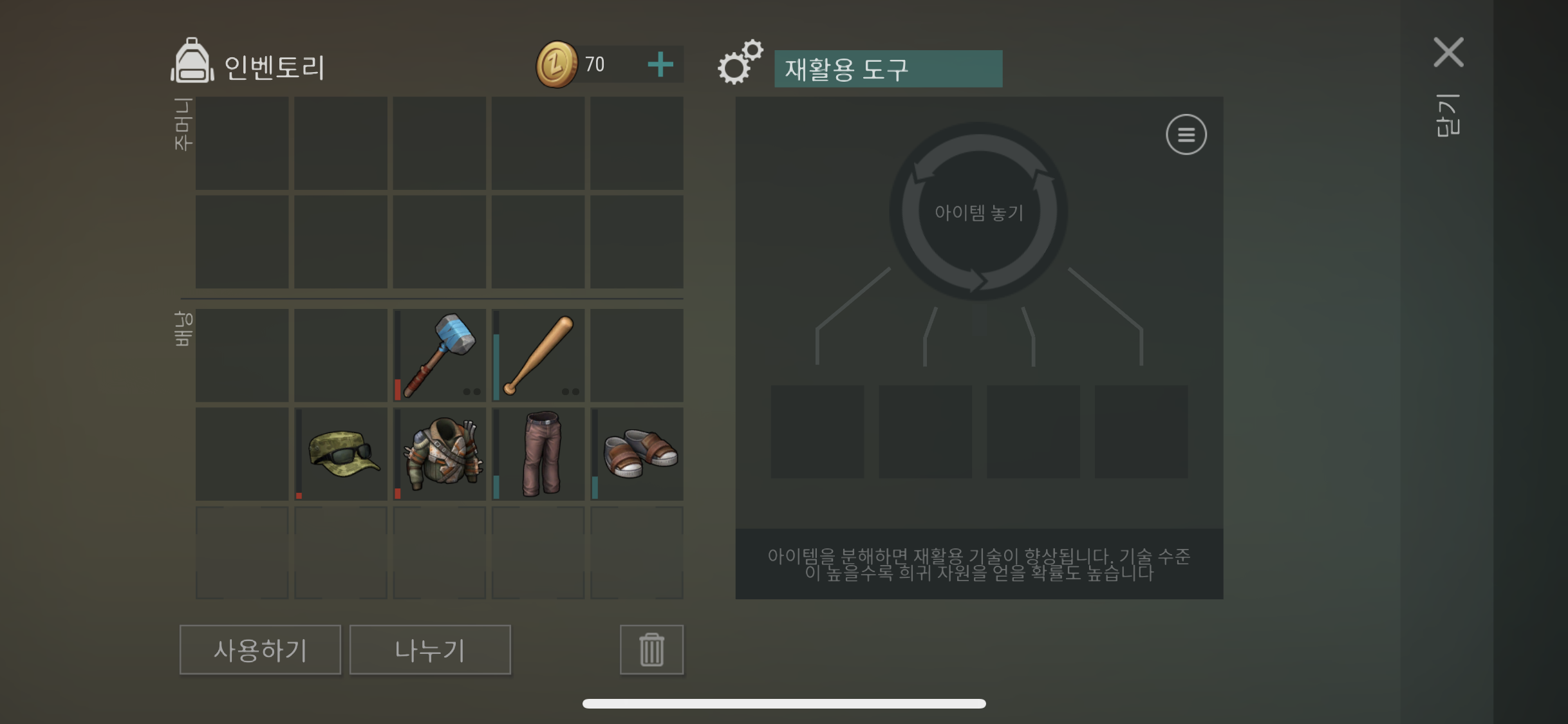 이렇게 재활용 도구 시설을 눌러 보면 재활용 할 아이템을 저 동그란 원 부분에 올려 놓으면 그 아래위 4가지 칸에 확률에 따라 아이템이 분해 되는 것으로 나온다. 아직은 어디에 공개 된 레시피가 없는 것 같은데 아이템을 각 종류 별로 올려 놓으면서 어떤 아이템들이 분해 되는지 스스로 찾아봐야 할 것 같다.