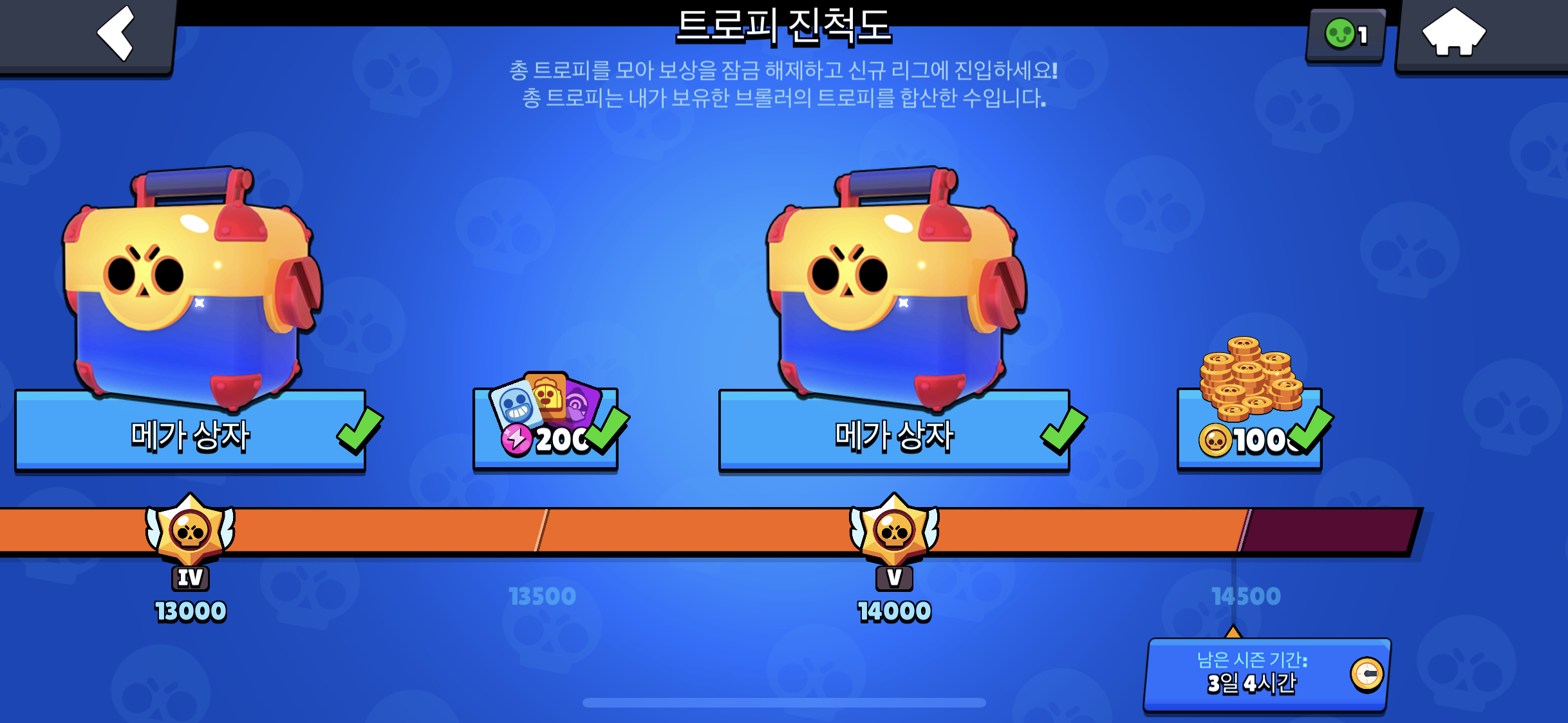 브롤스타즈 트로피 진척도의 14500점의 보상은 진작에 받았지만 사실 15000점 이후에 어떤 다른 보상이 있을까 궁금했다. 그래서 일단은 15000점을 목표로 트로피점수 상승에 초점을 맞췄다.