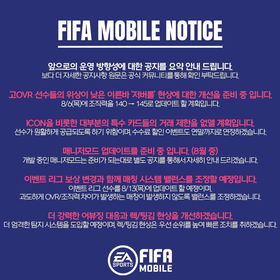 많은 감독님께서 남겨주시는 소중한 의견들은 저희 FIFA 모바일 담당자 모두 귀기울여 듣고 있습니다. 저희가 조정할 수 있는 부분들은 빠르게 개선하여 나아지는 모습을 보여드릴 수 있도록 노력하겠습니다.