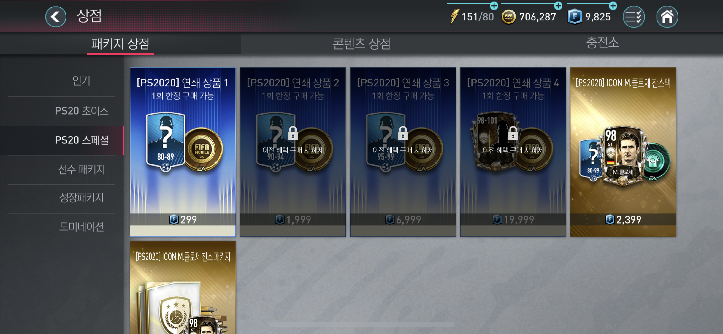 상점 메뉴로 들어가서 패키지상점에서 PS20 스페셜 항목에 들어가면 이렇게 PS2020 연쇄상품 4번에서 뽑기로 획득 가능 하다.