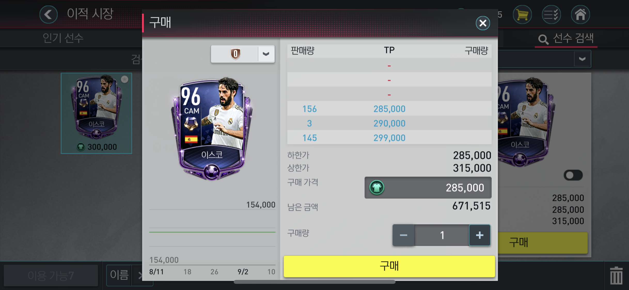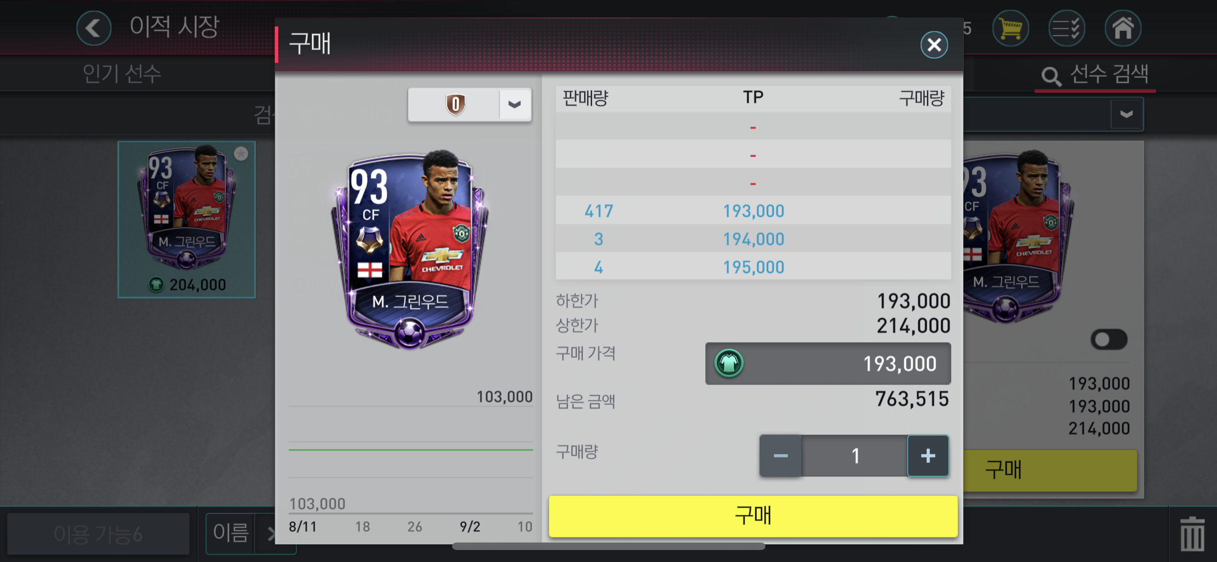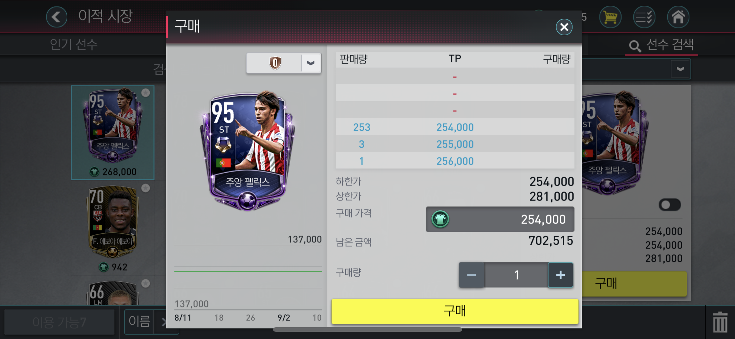 그 다음 이벤트리그에서 얻을 수 있었던 3명의 선수가 이적시장에서 거래가 가능하다. 매도 매물이 쌓여있기 때문에 먼저 나왔던 이벤트 리그 선수들 가격대까지 적절히 떨어질 것으로 예상한다.