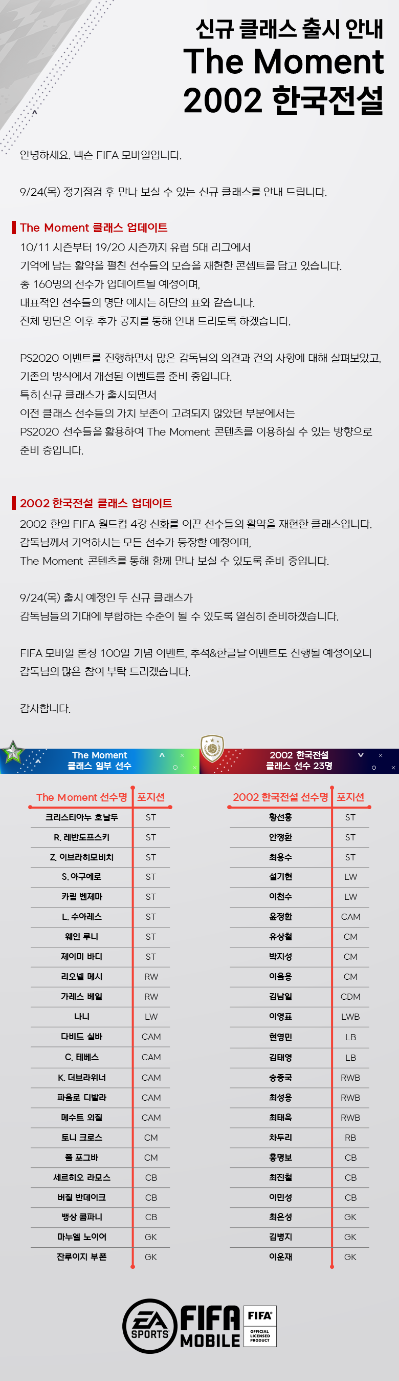 [피파모바일-공지-퍼옴] 신규 클래스 출시 안내 [The Moment, 2002 한국전설]