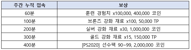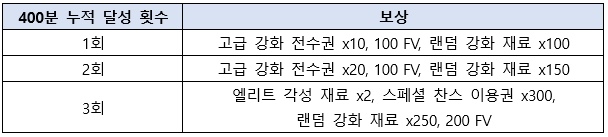 * 400분 누적 2회 보상이 수정되었습니다. (고급 각성 전수권 x10 → 고급 강화 전수권 x20)