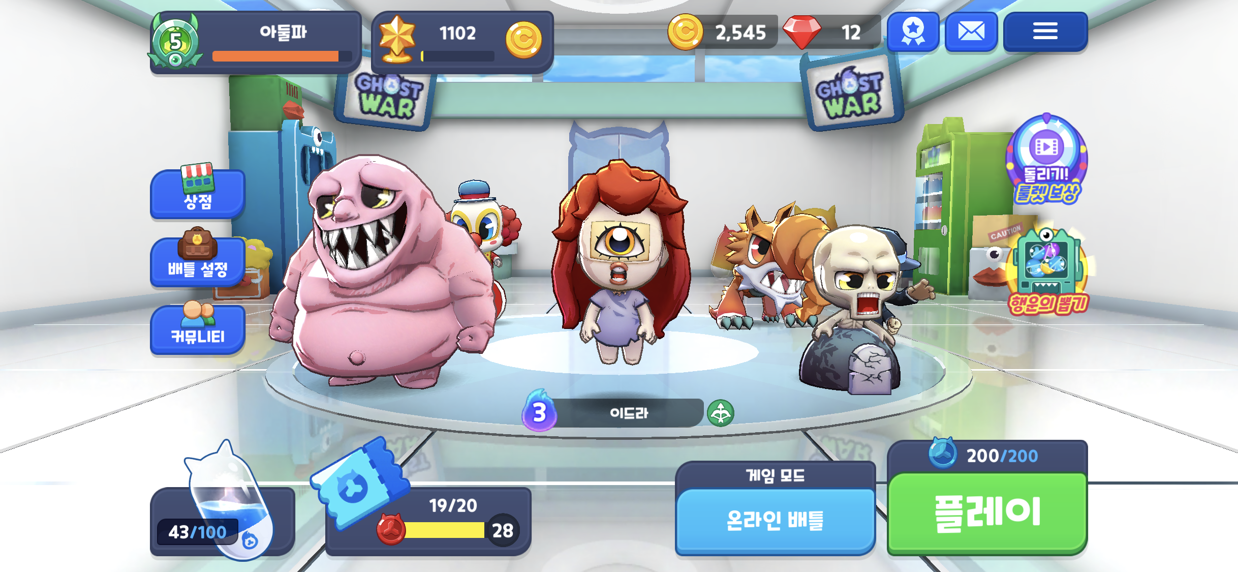 위 화면은 1:1 온라인 배틀 화면이다. 전투 진영을 이렇게 좌우 각 3개의 타워가 있는 3개위 라인으로 구분 되어 있고, 라인에 소환 된 고스트들은 진행방향에 따라 앞으로 나아가면서 마주치는 고스트들과 전투를 진행하게 되고, 제한시간 안에 상대방의 3개 타워를 모두 부숴버거나 상대방보다 많은 타워를 부숴버리게 되면 승리한다.
