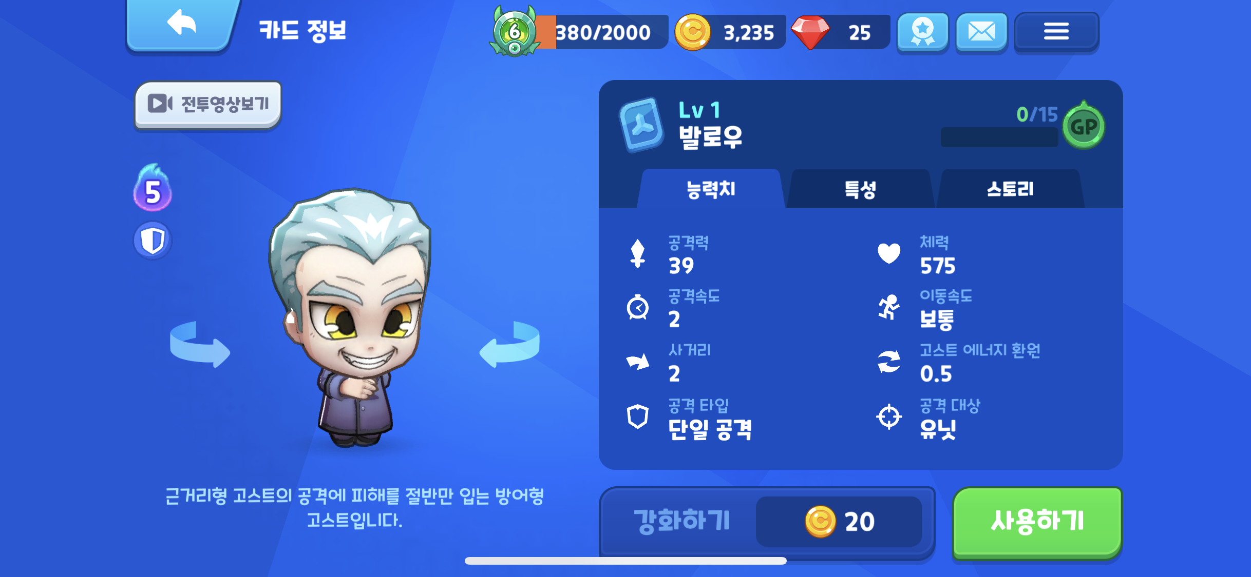두번째로는 하이퍼캡슐을 오픈해서 나온 발로우이다. 에너지 소비는 5이고, 방어형 고스트이다. 이미 레벨업을 많이 해 놓은 방어형 고스트를 사용중이라 아마 사용 하지 않을 것 같지만 나중에 레벨을 올리게 되면 한번 사용 해 봐야겠다.