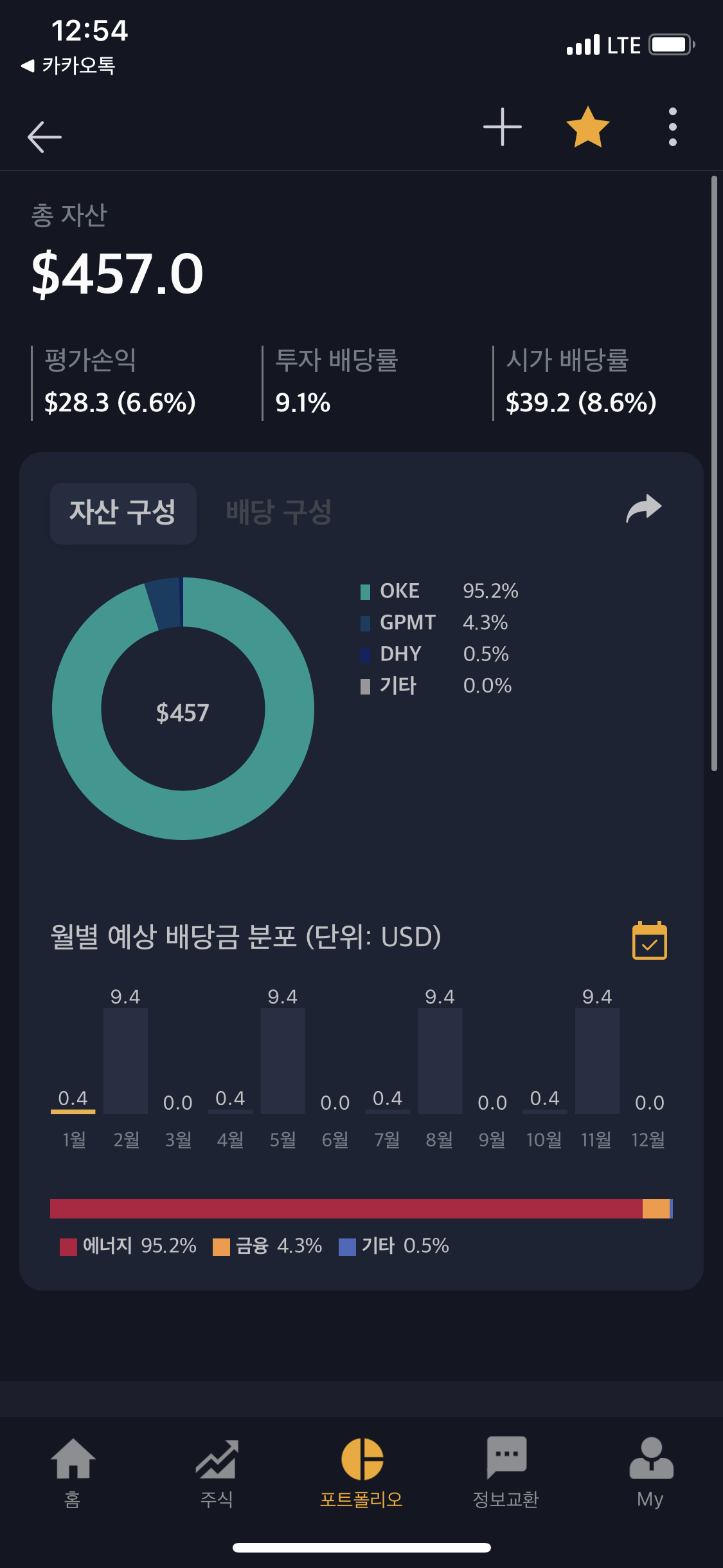 드디어 개별 종목이 추가 된 포트폴리오의 모습이 나왔다. 총 자산 배당률, 월별 배당 예상금액, 자산 구성 차트등이 한눈에 볼 수 있게 표시된다.