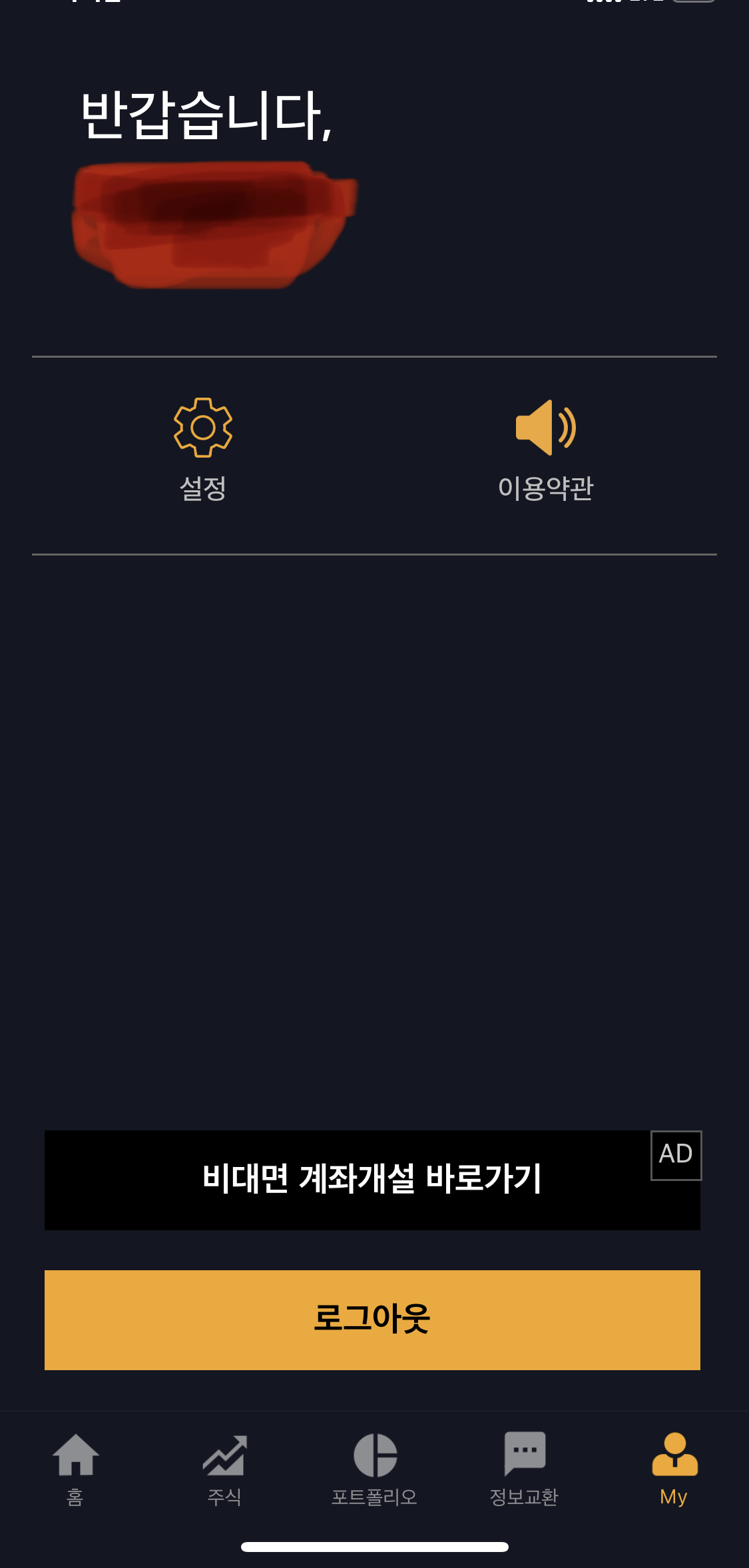 맨처음 홈 화면에서는 아직 가입 되어 있지 않기 때문에 본인 이름으로 나오지 않는다. 홈 화면에는 기본적인 정보나 환율, 뉴스등이 표기 된다.