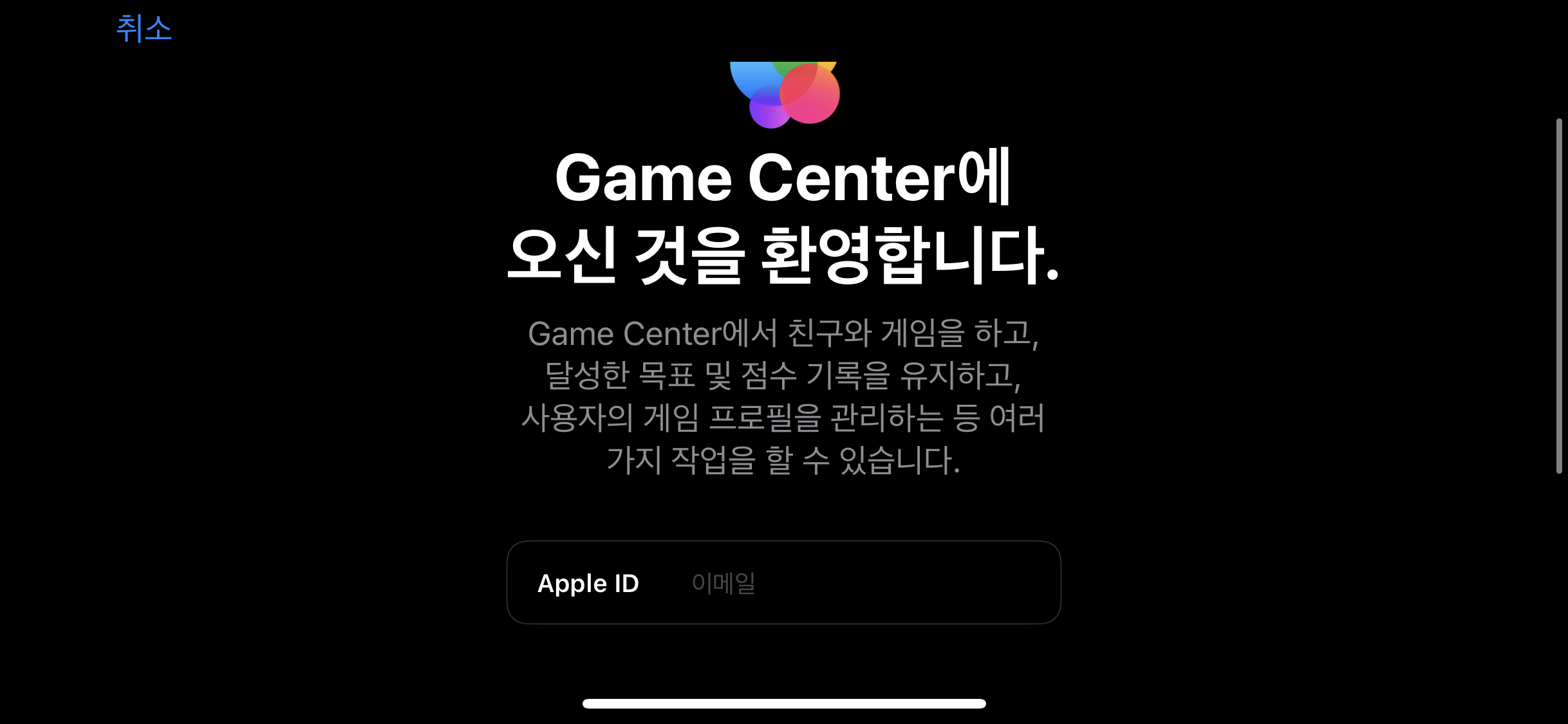 게임센터 로그인 화면이 떴는데 여기가 가장 중요하다. 기존에 플레이하던 게임센터의 계정을 입력하면 된다. 나 같은 경우는 아이폰 사용 애플계정과 게임센터 계정이 달랐다. 초기 아이폰 구매 후 계정 설정 시 구계정과 신계정을 사용하려고 하다 보니 섞여 있었다.