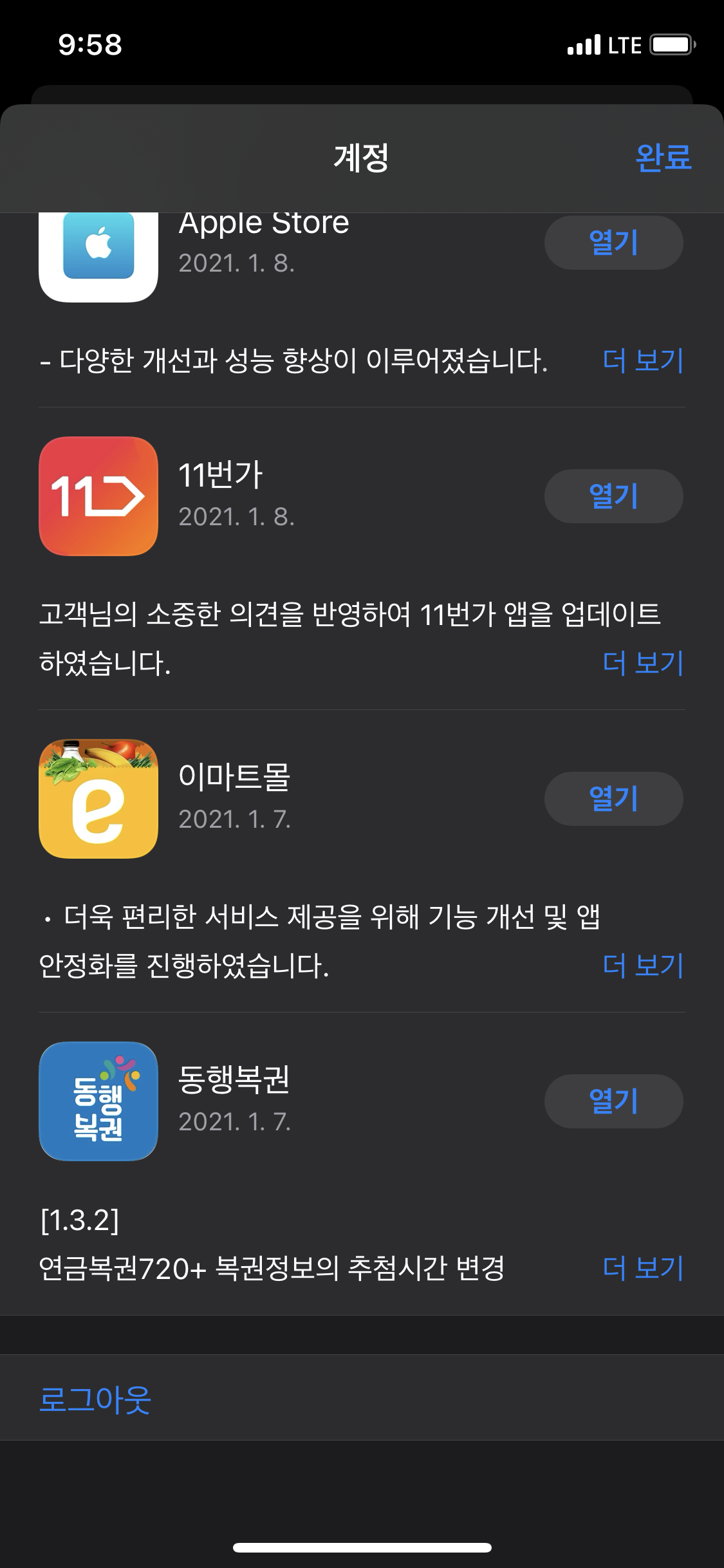 내 아이폰에 설치 된 앱 목록이 보이고 스크롤을 가장 하단으로 쭉 내리면 로그아웃이 보인다. 로그아웃 클릭한다.