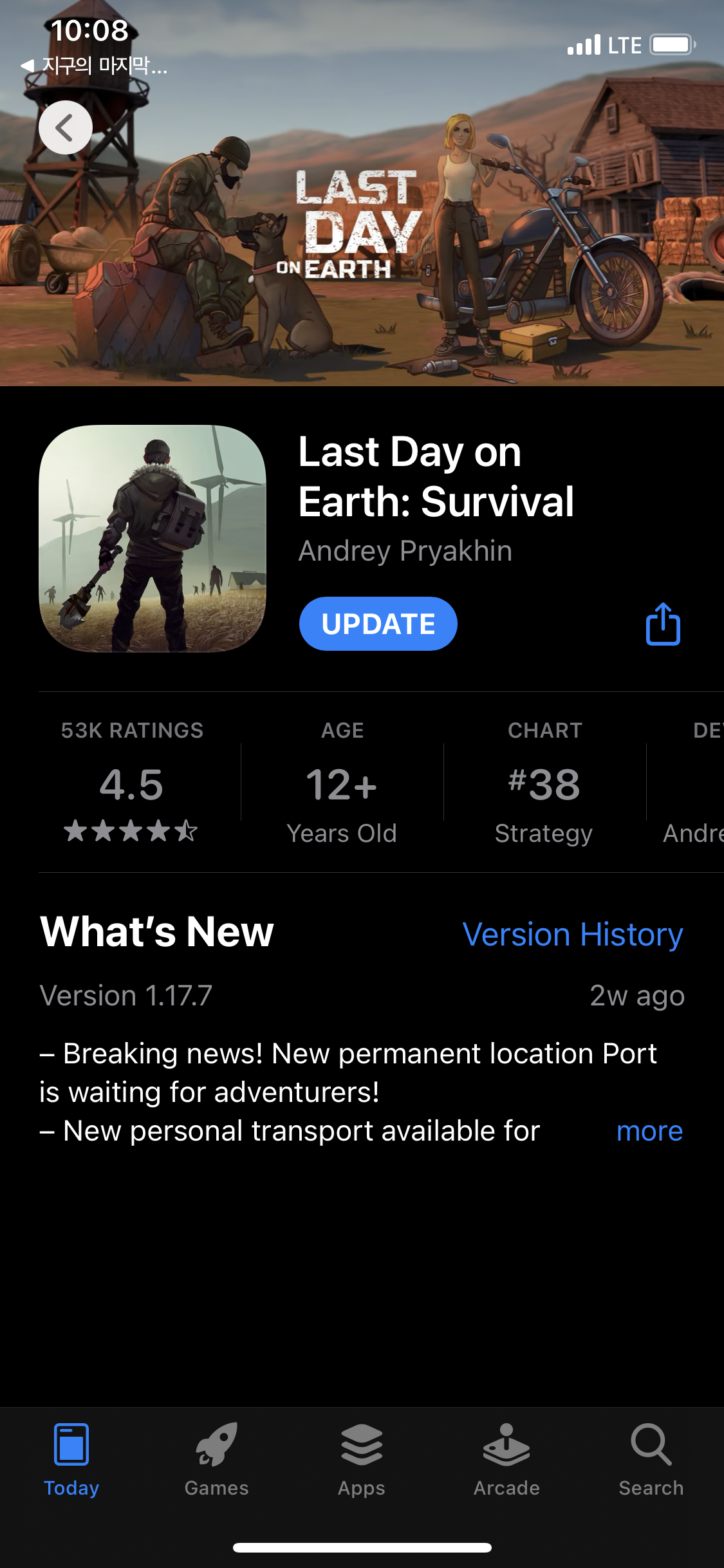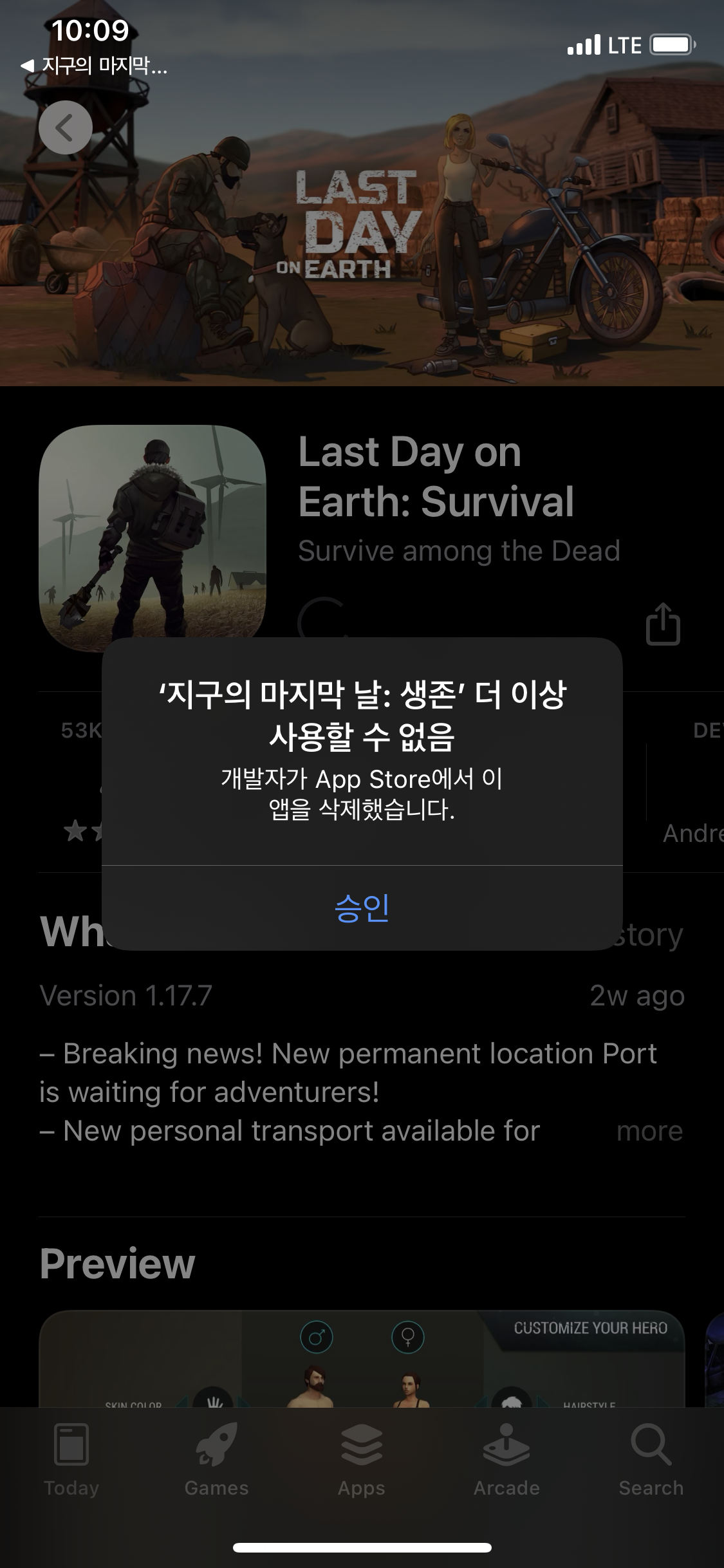 자 그럼 지구의 마지막날 생존을 검색해서 업데이트를 진행 해 보자. 이미 한국 앱스토어에서 받은 게임이 설치 되어 있기 때문에 오픈으로 보인다. 열기를 클릭해서 게임을 실행한다.
