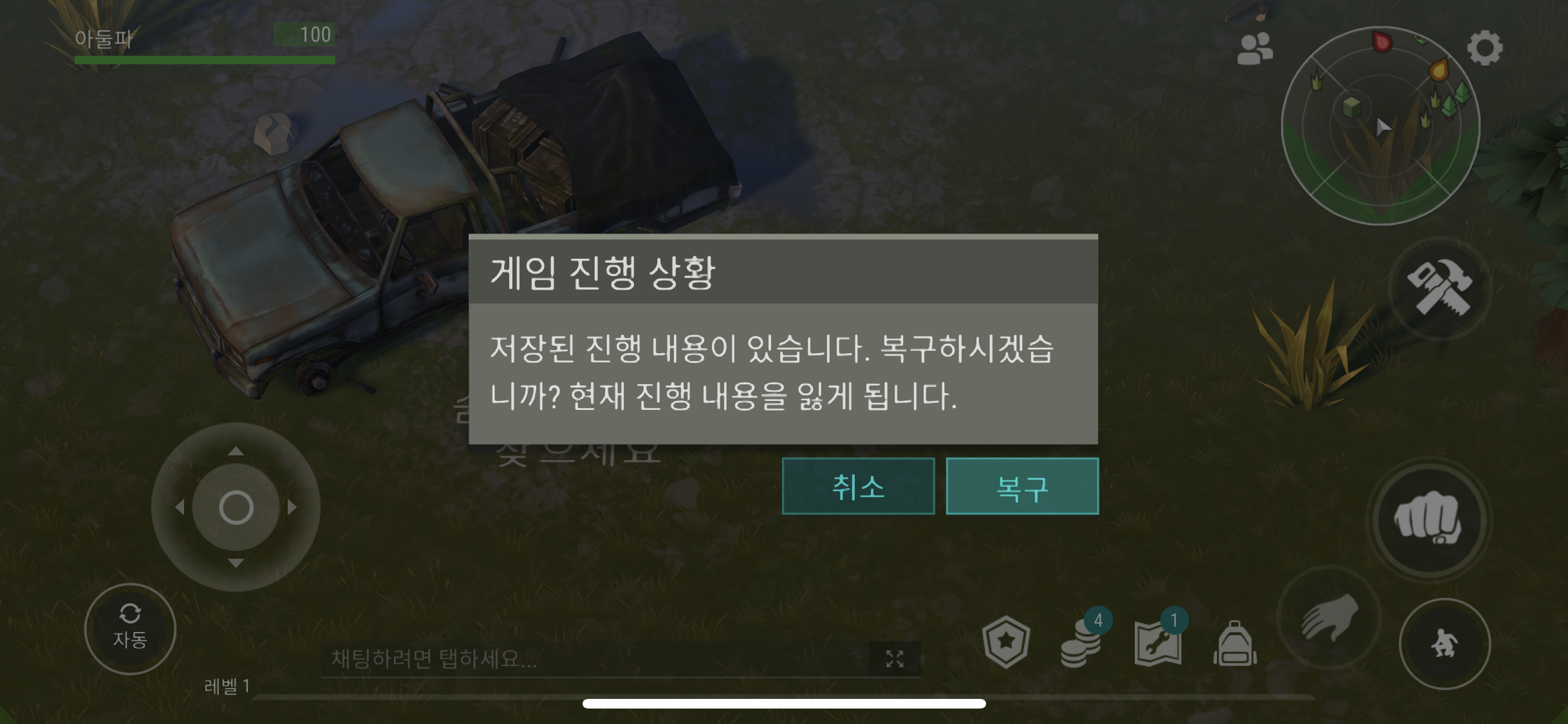 이런식으로 이전에 진행하던 내용이 있다고 복구 할꺼냐고 물어본다. 복구 버튼을 누르게 되면 이렇게 기존에 플레이 하던 계정의 정보를 얻어 올 수 있다!