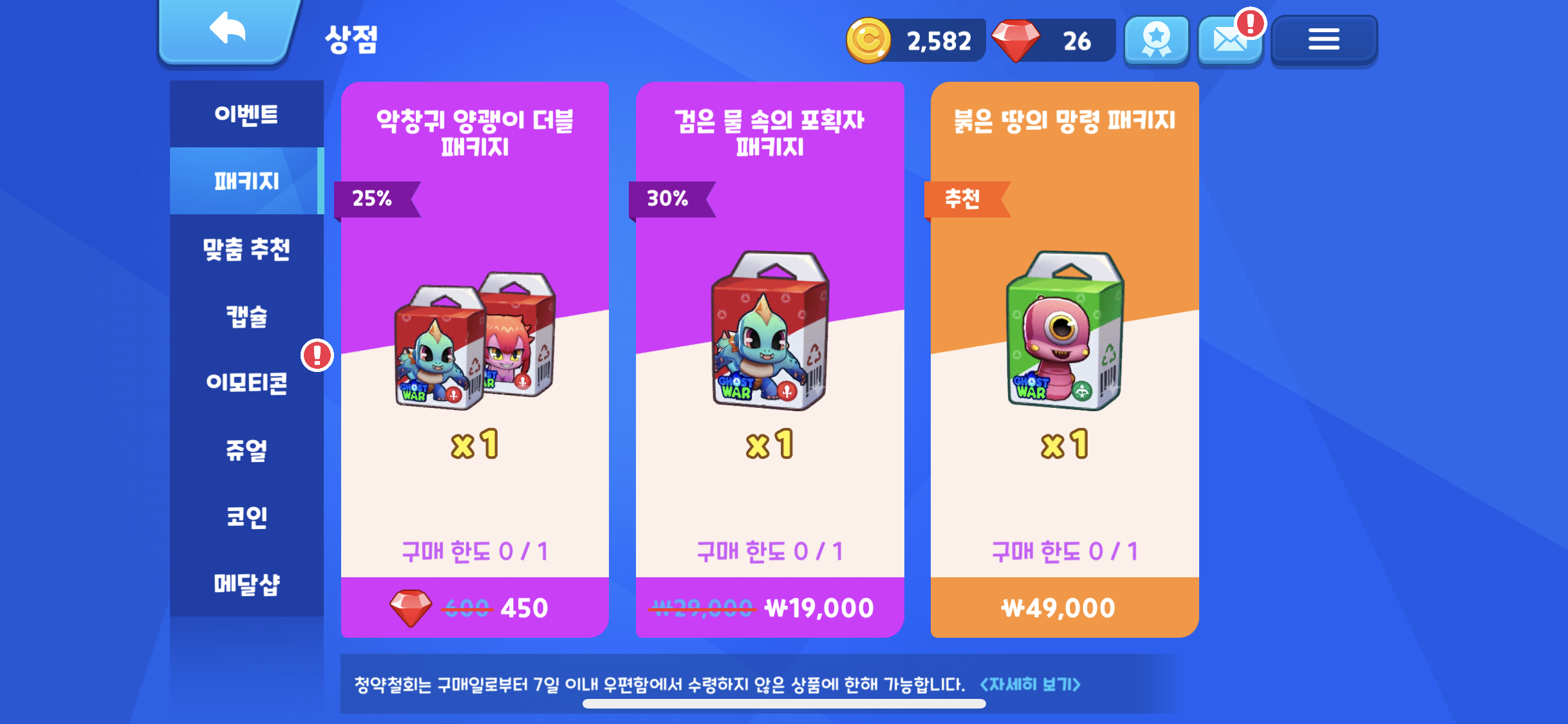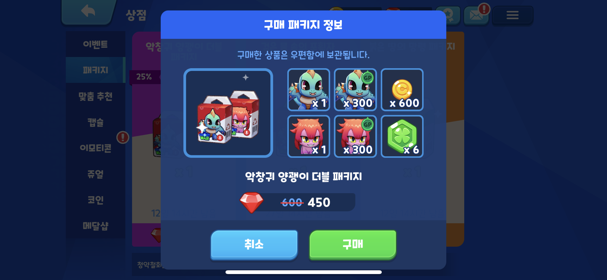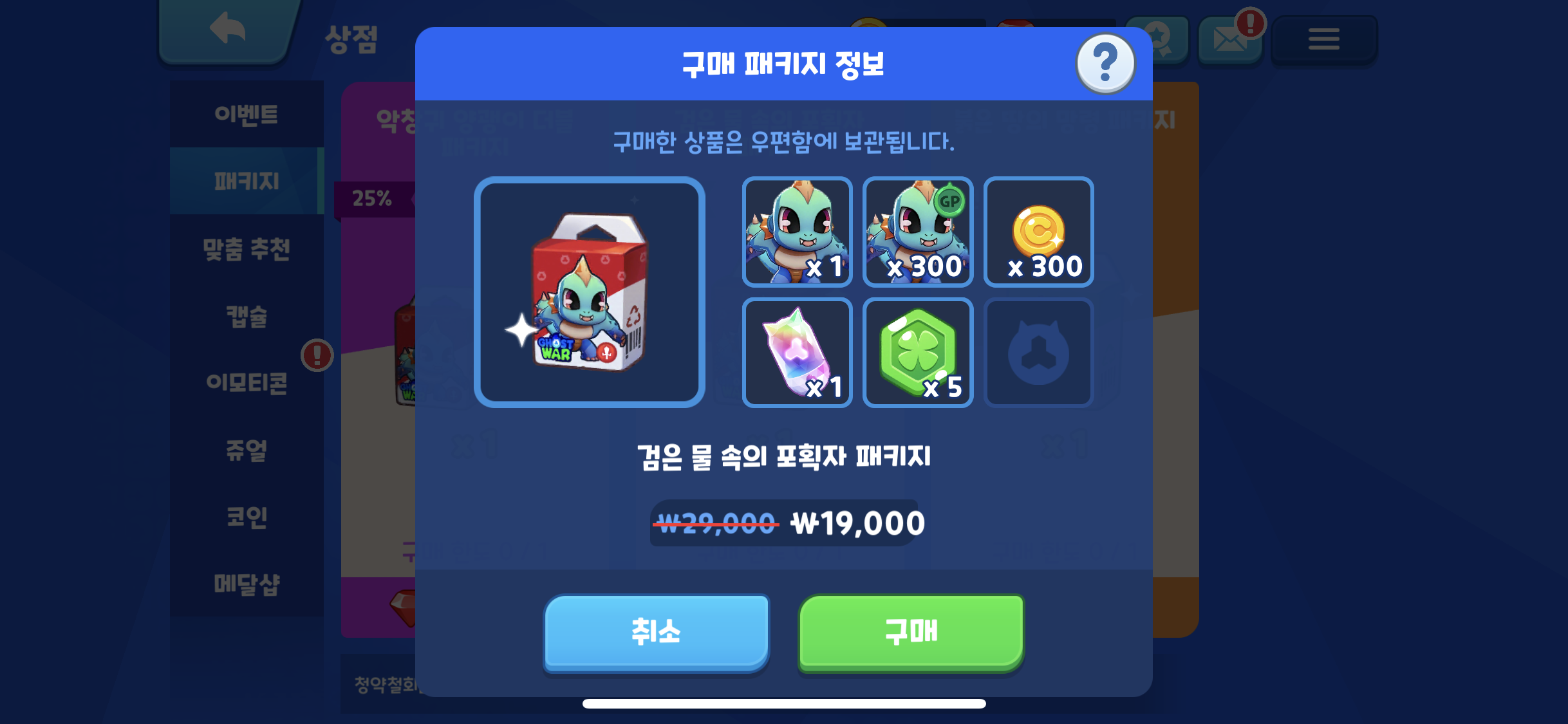 신규패키지가 추가 되었는데, 악창귀 양괭이 더블 패키지 (주얼구매) 검은 물 속의 포획자 패키지 (결제구매)가 추가 되었다.