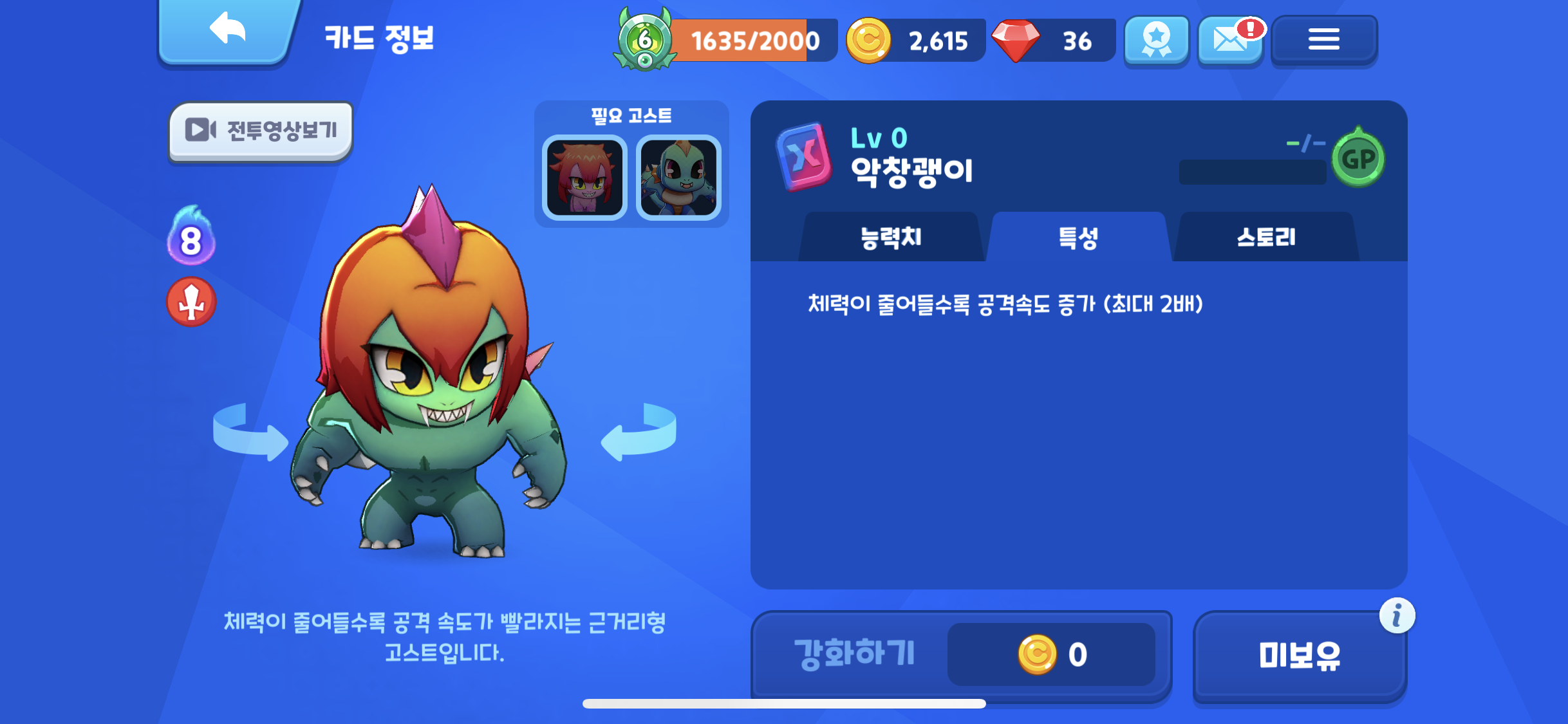 그리고 추가 된 악창귀이다. 고스트에너지 5 소비 되는 근거리 고스트로 공격력은 72 체력은 396이다.