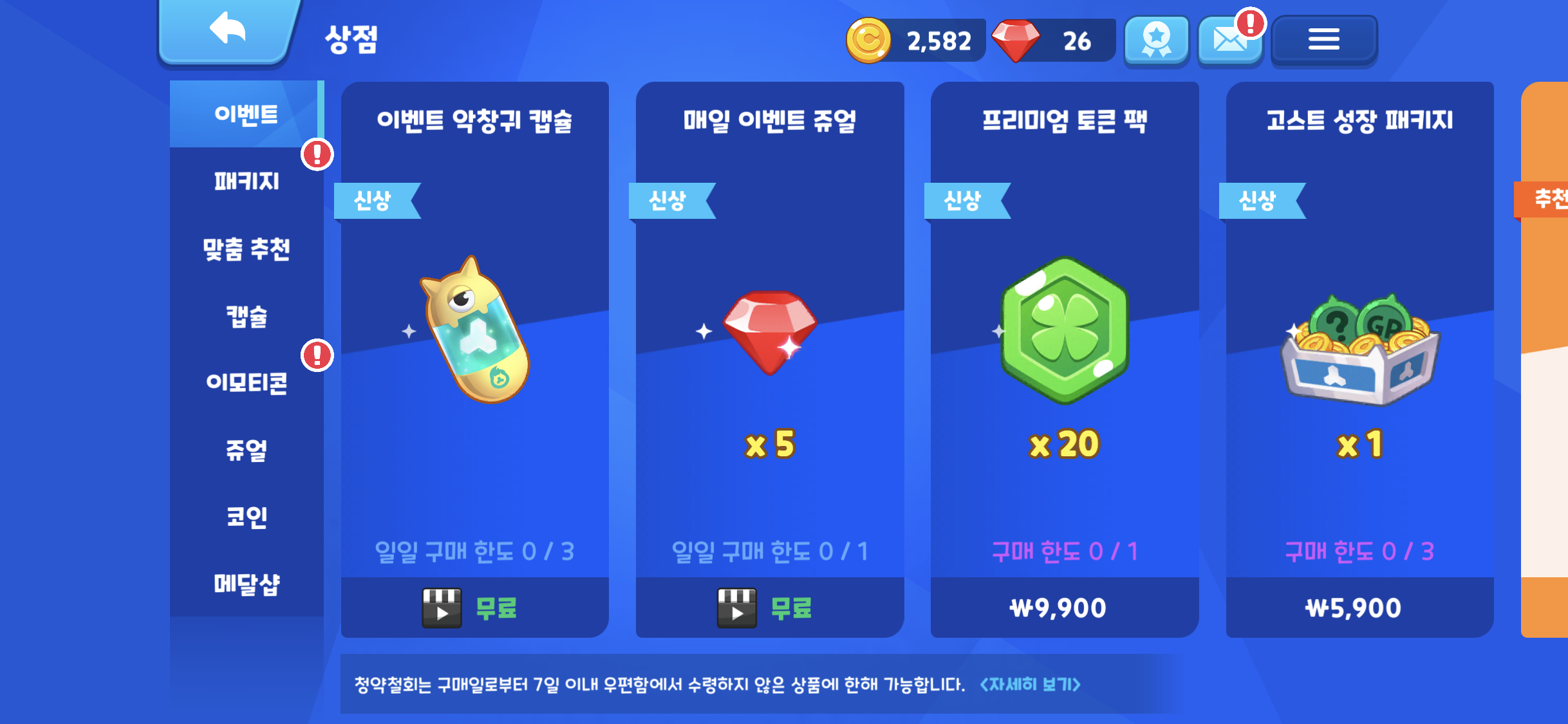 상점의 이벤트 아이템이 변경 된 것을 볼 수 있다. 이벤트 악창귀 캡슐을 꾸준히 오픈하다보면 얻을 수 있을지도 모른다! 광고를 열심히 봐야겠다!