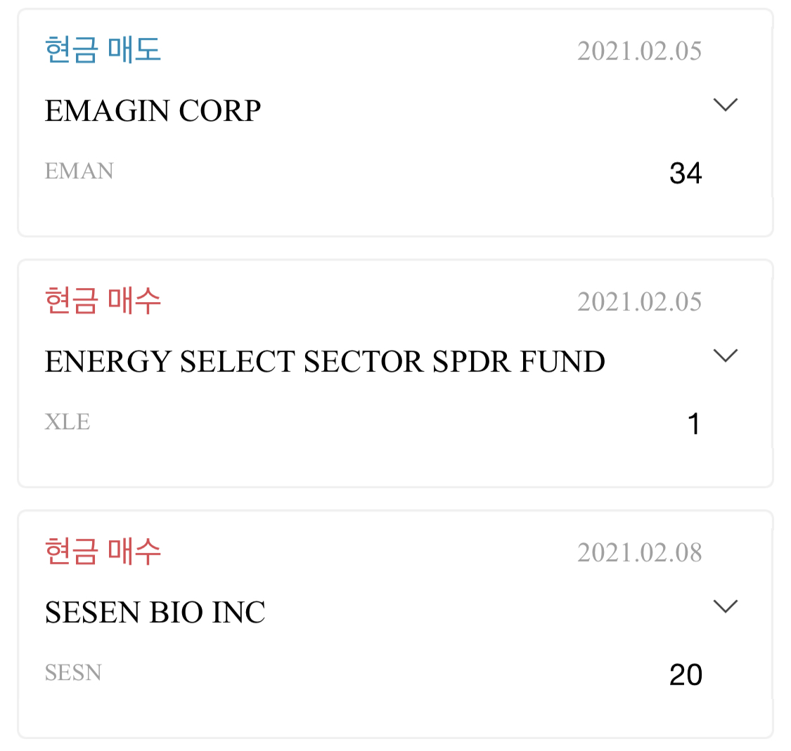 [미국주식] 미국주식 매매일지(2/9) EMAN, GPMT, OKE 최종 매도 / XLE, SESN 신규 매수 / BAC, ASG 추가매수