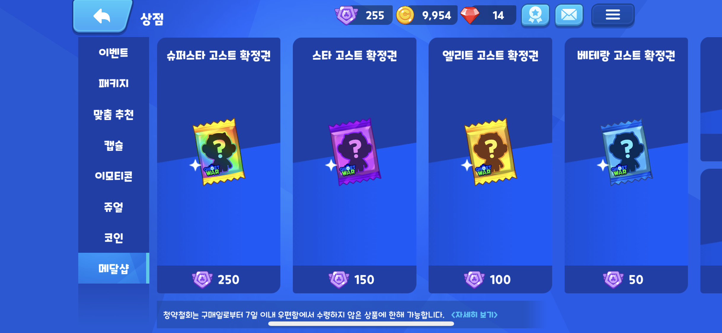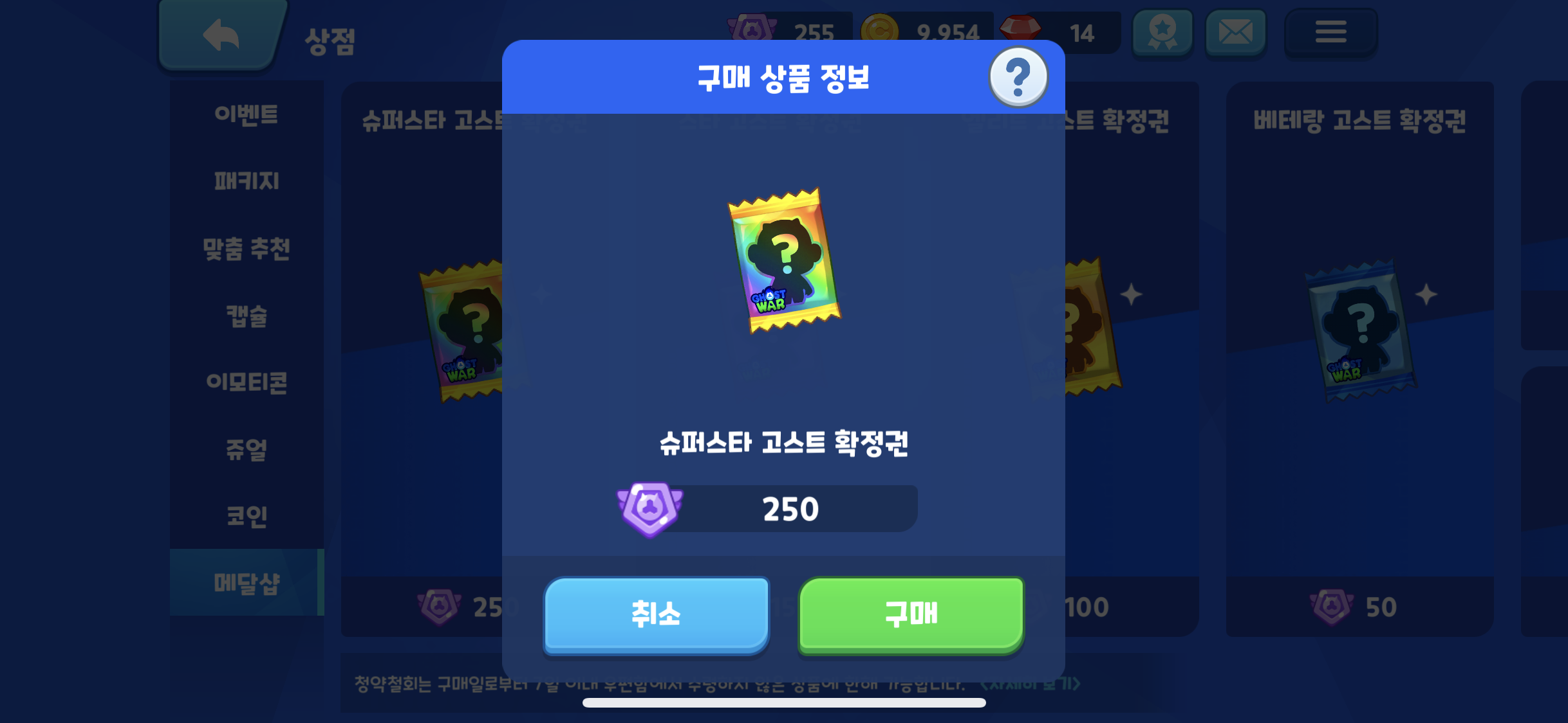 슈퍼스타 고스트 확정권을 구매하기 위해 열심히 하이퍼캡슐을 뽑아서 메달을 250 모은 후 슈퍼스타 고스트 뽑기를 진행 했다.
