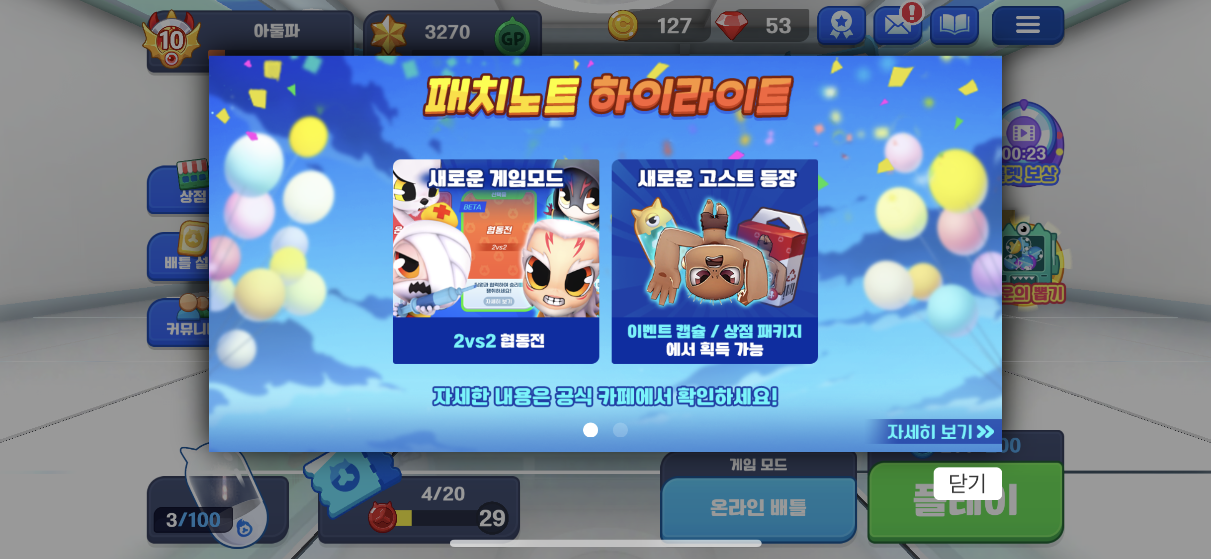 - 다른 유저와 팀을 맺어 승부하는 2대2 모드가 출시 되었습니다!