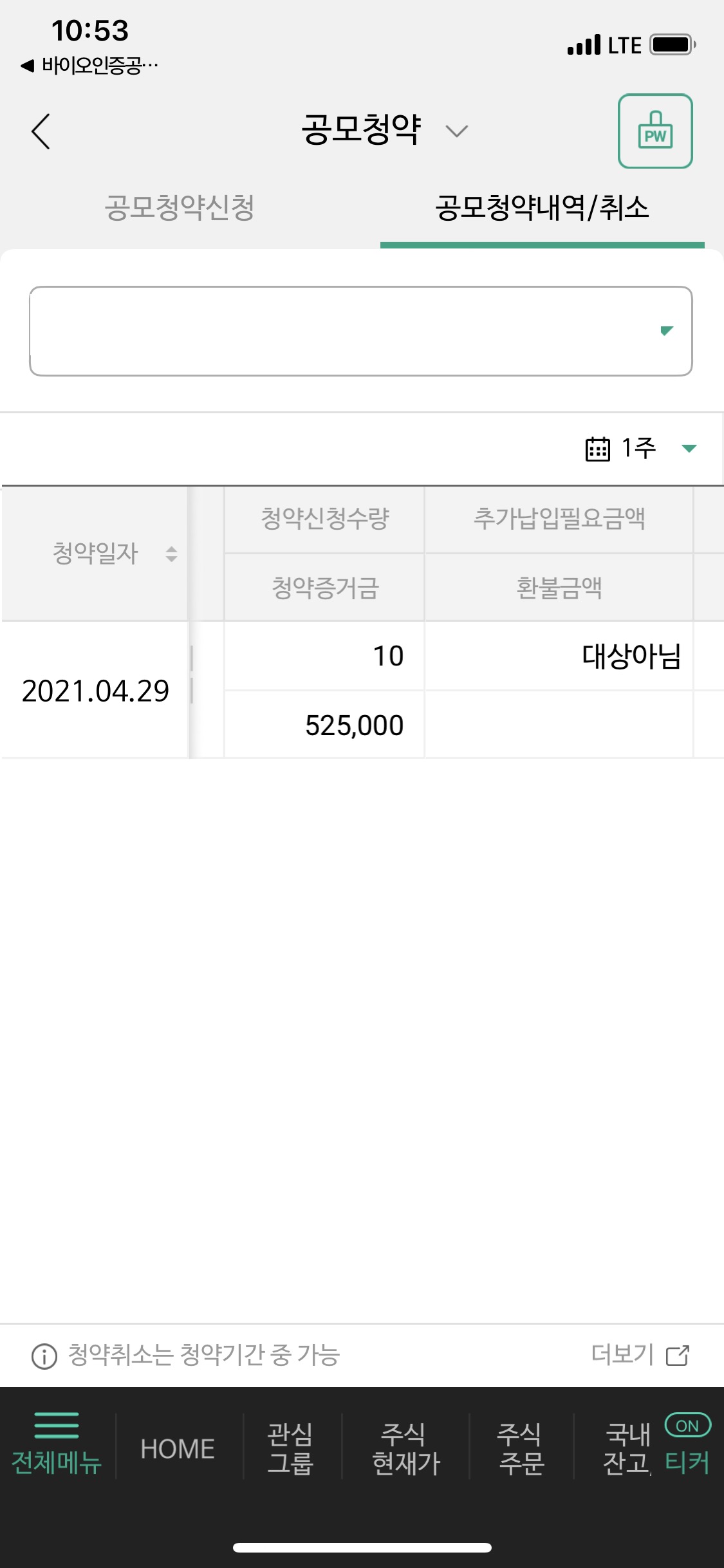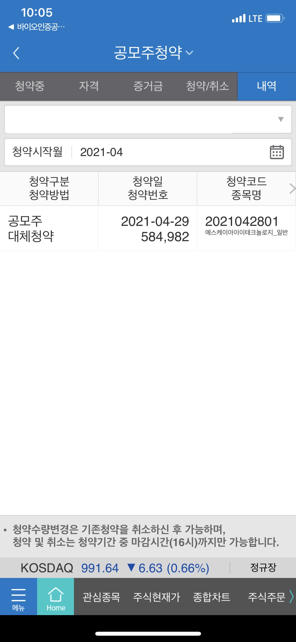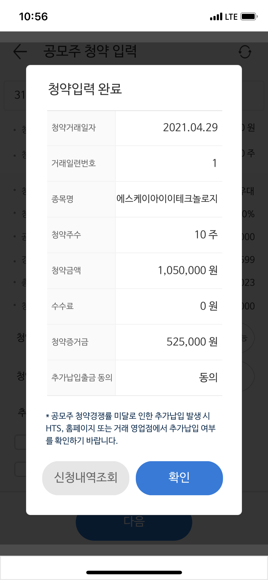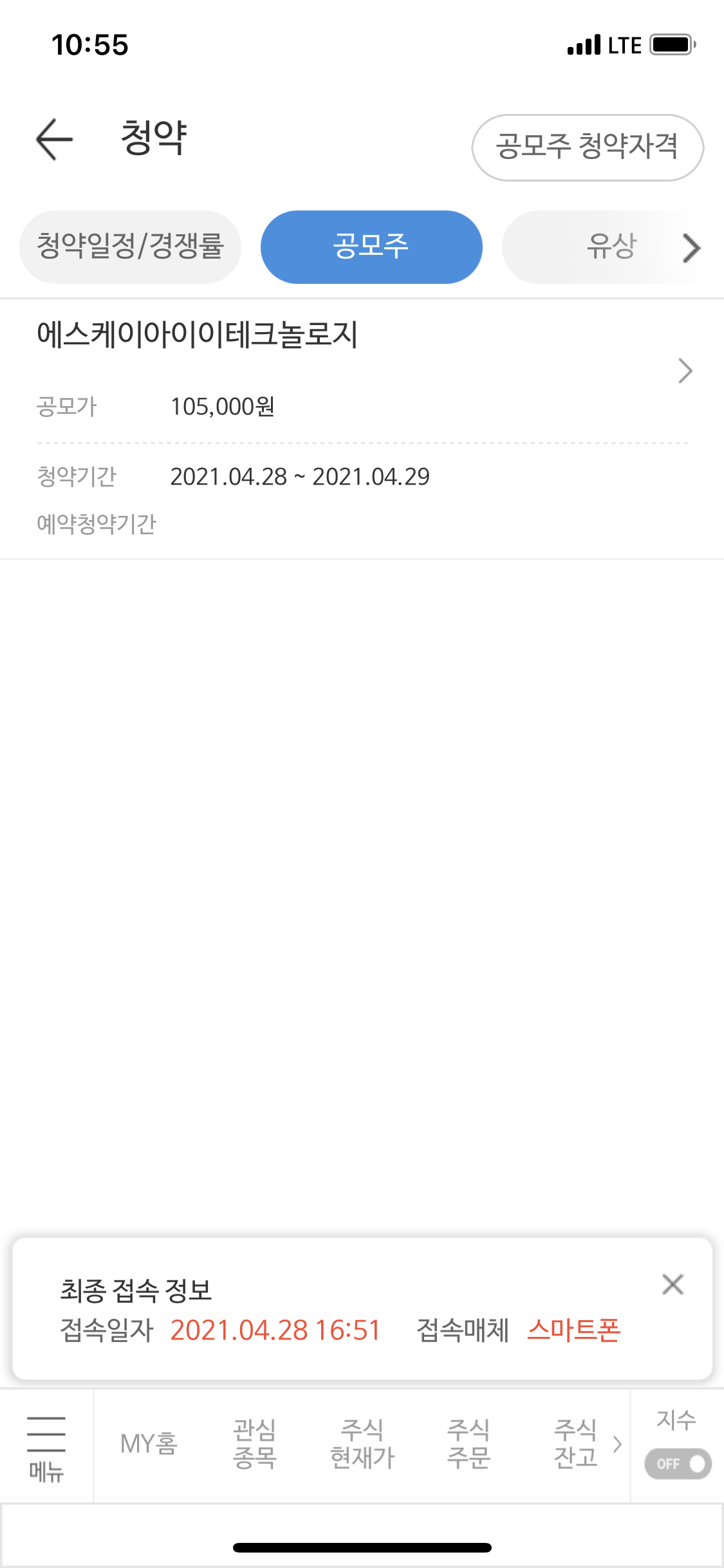 그리고 마지막으로 주관사인 미래에셋증권은 이번 청약을 위해서 새로 계좌를 만들었다. 미래에셋증권에서도 에스케이아이이테크놀로지 종목의 공모청약을 완료 하였다.
