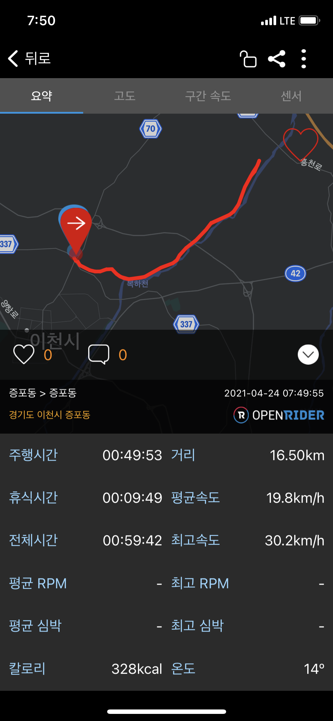 내 기준으로는 증포사거리에서 백사면 상용리 까지 왕복 시간은 약 50분 정도 걸리고, 그 거리는 약 16.5km이다.