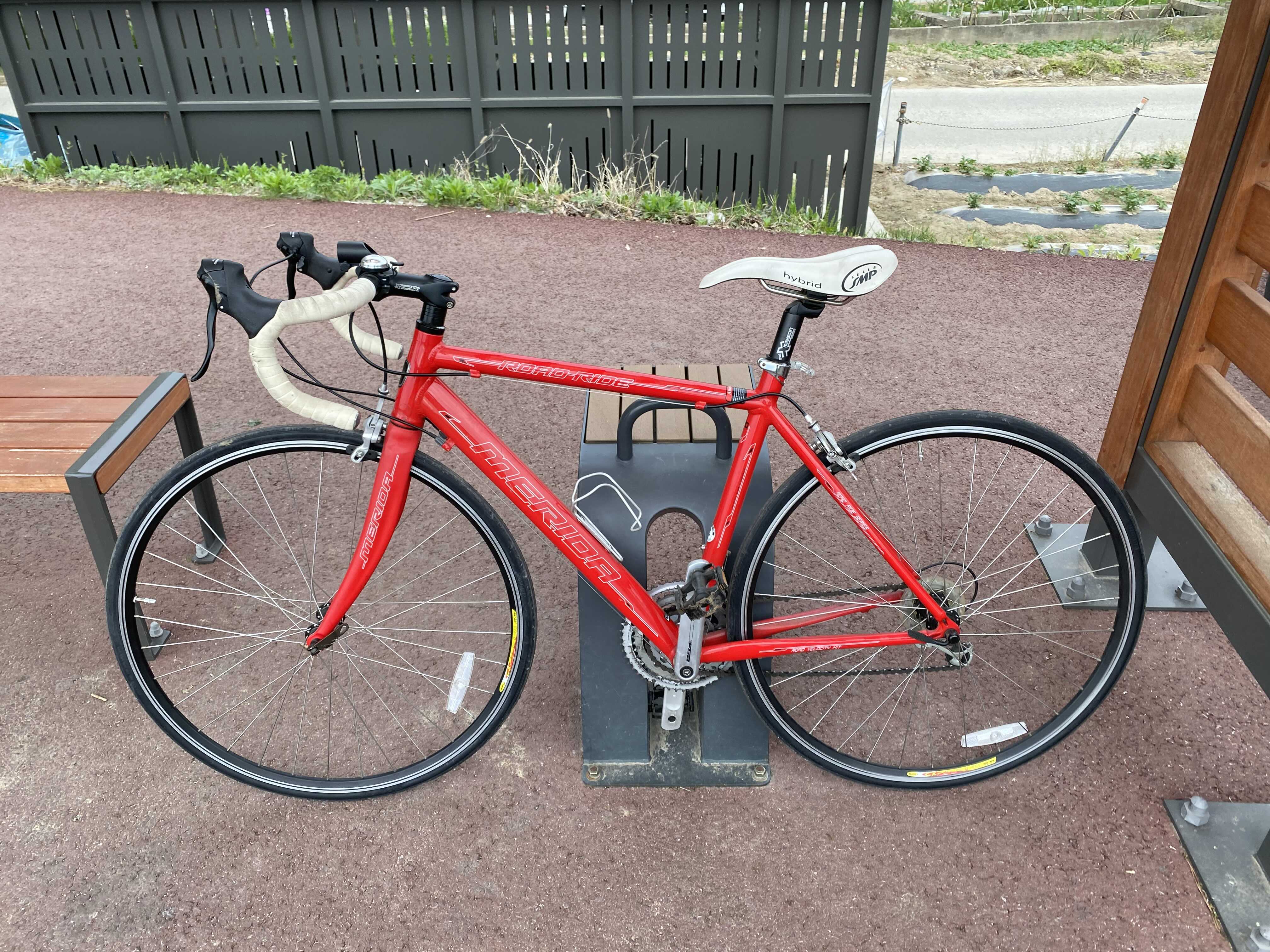 의자 옆에는 이렇게 자전거를 거치 할 수 있는 거치대도 있다. 거치를 이렇게 하는게 맞는지 모르겠다. 사진을 찍기 위해 잠시 쉬어가 본다. 나의 첫 로드바이크이자 연식이 오래된 로드바이크인 메리다880-24 자전거. 낡았지만 아직은 탈만 하다.