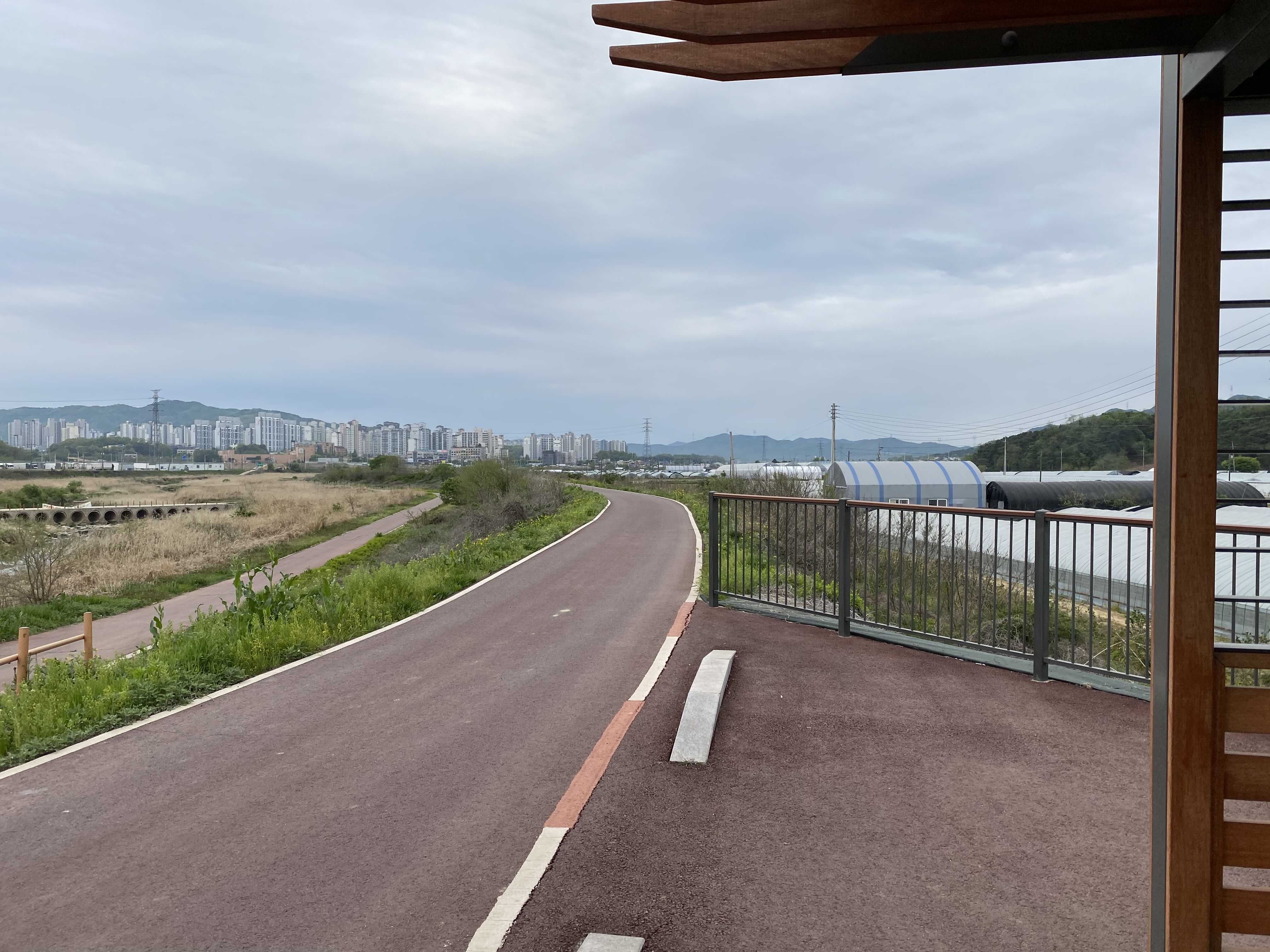 또 나온 중간 쉼터, 그리고 쭉 뻗어 있는 자전거 도로가 보이고 복하천 아래 쪽으로 내려갈 수 있는 길이 보인다.
